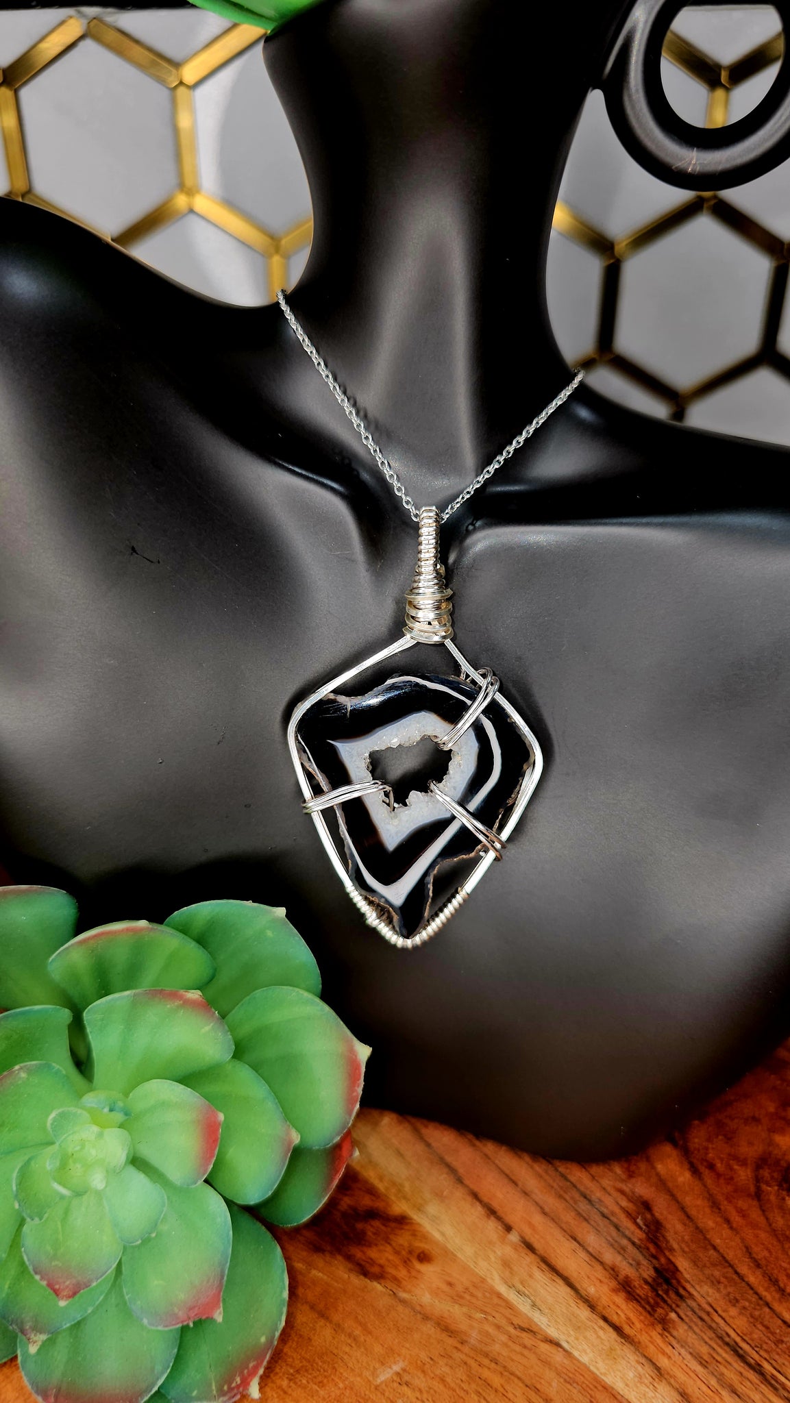 Black Window Druzy Geode pendant wrapped in silver coated copper wire.