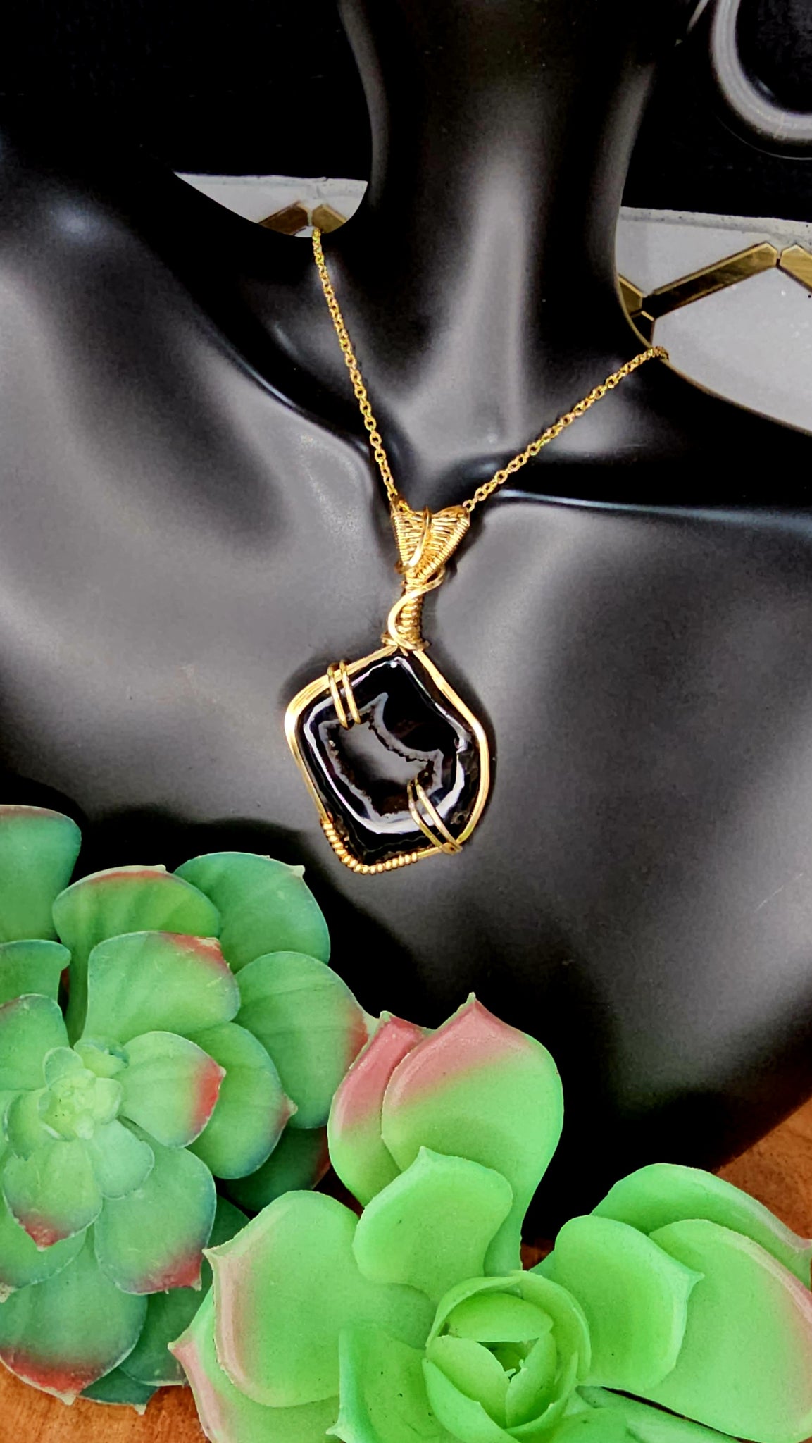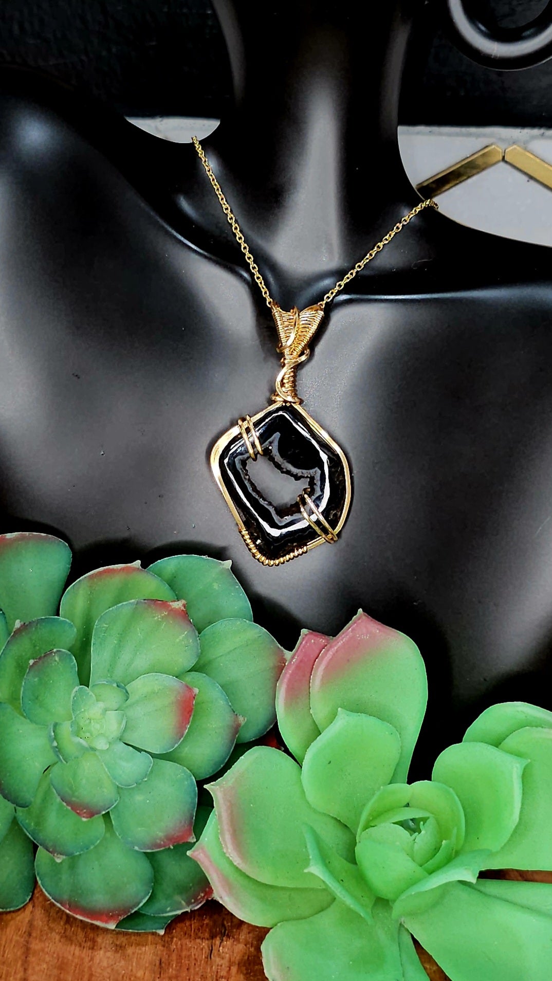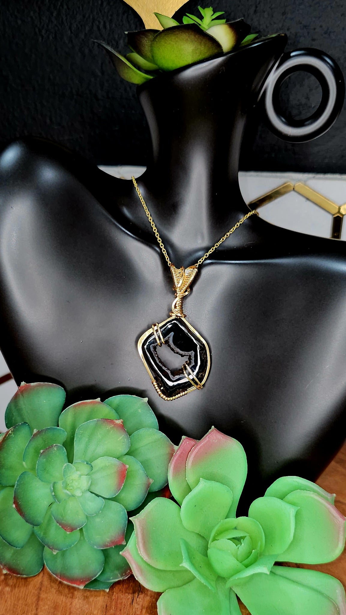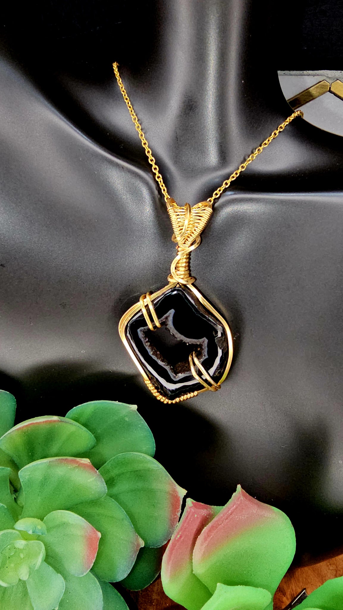 Black Window Druzy Geode pendant wrapped in silver coated copper wire.