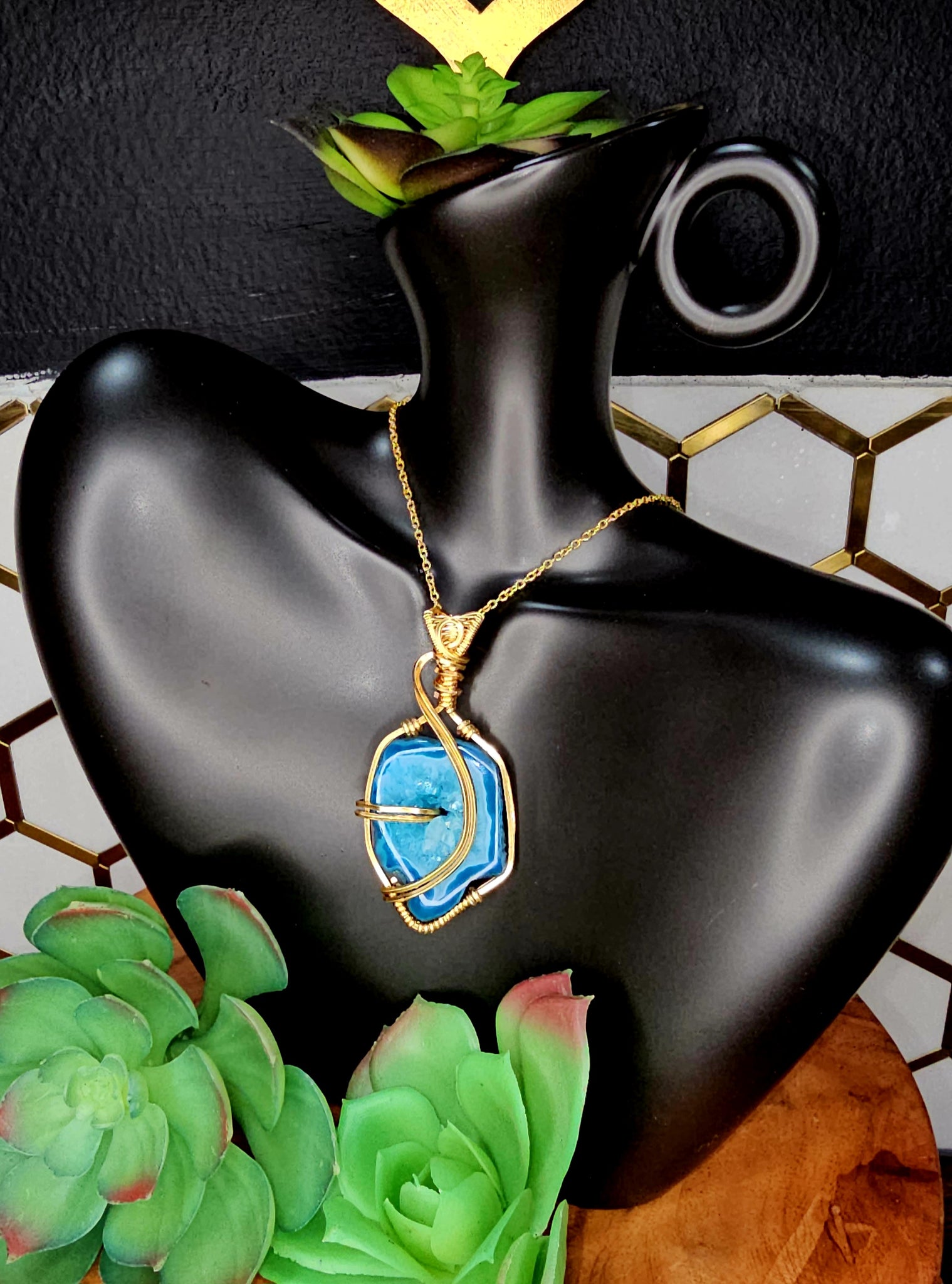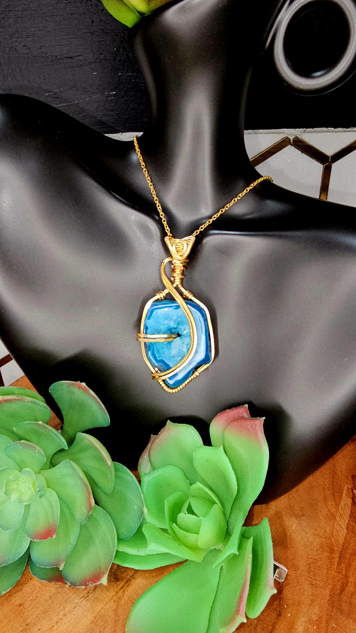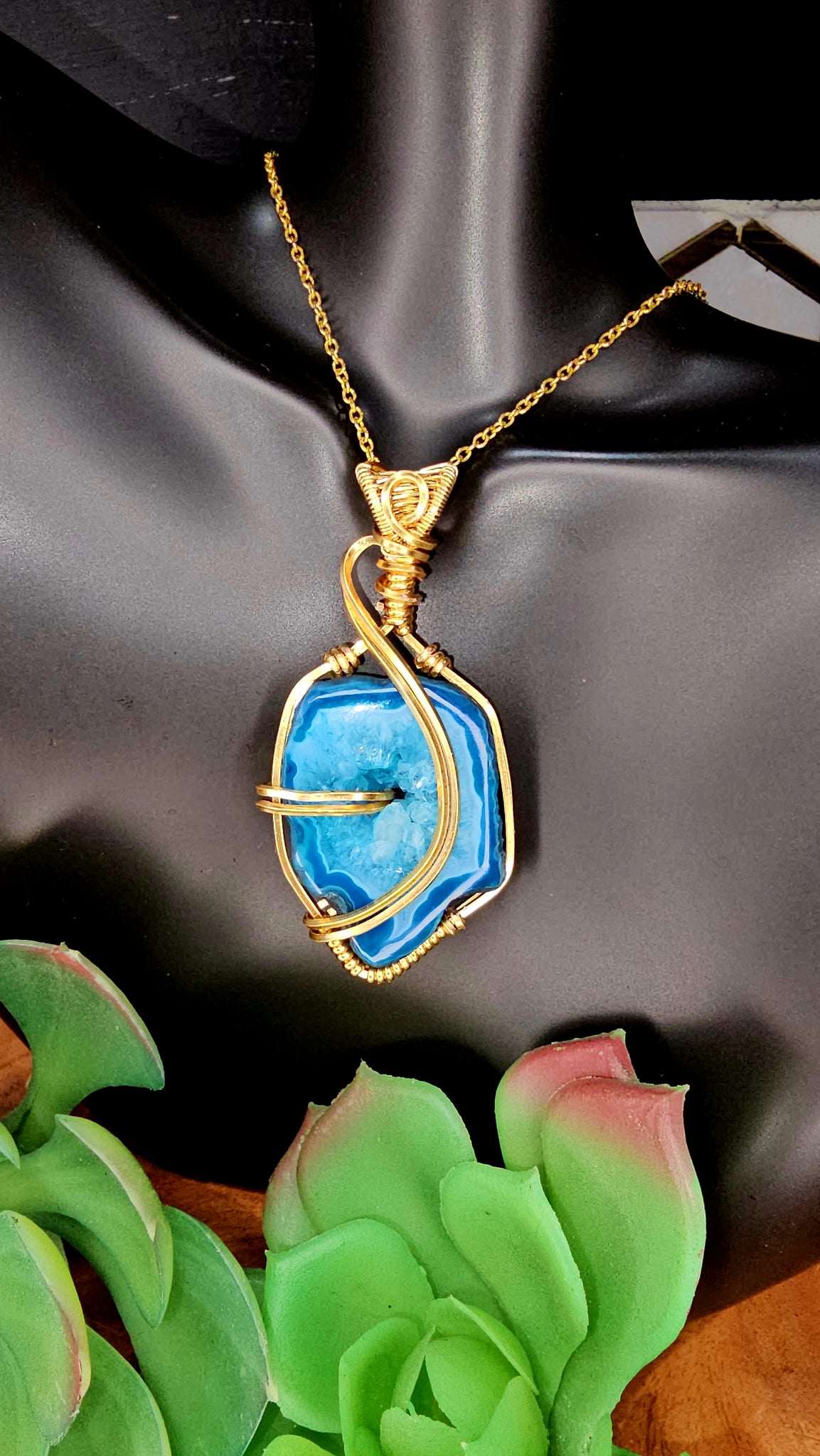Blue Window Druzy Agate Geode pendant wrapped in Gold coated copper wire.