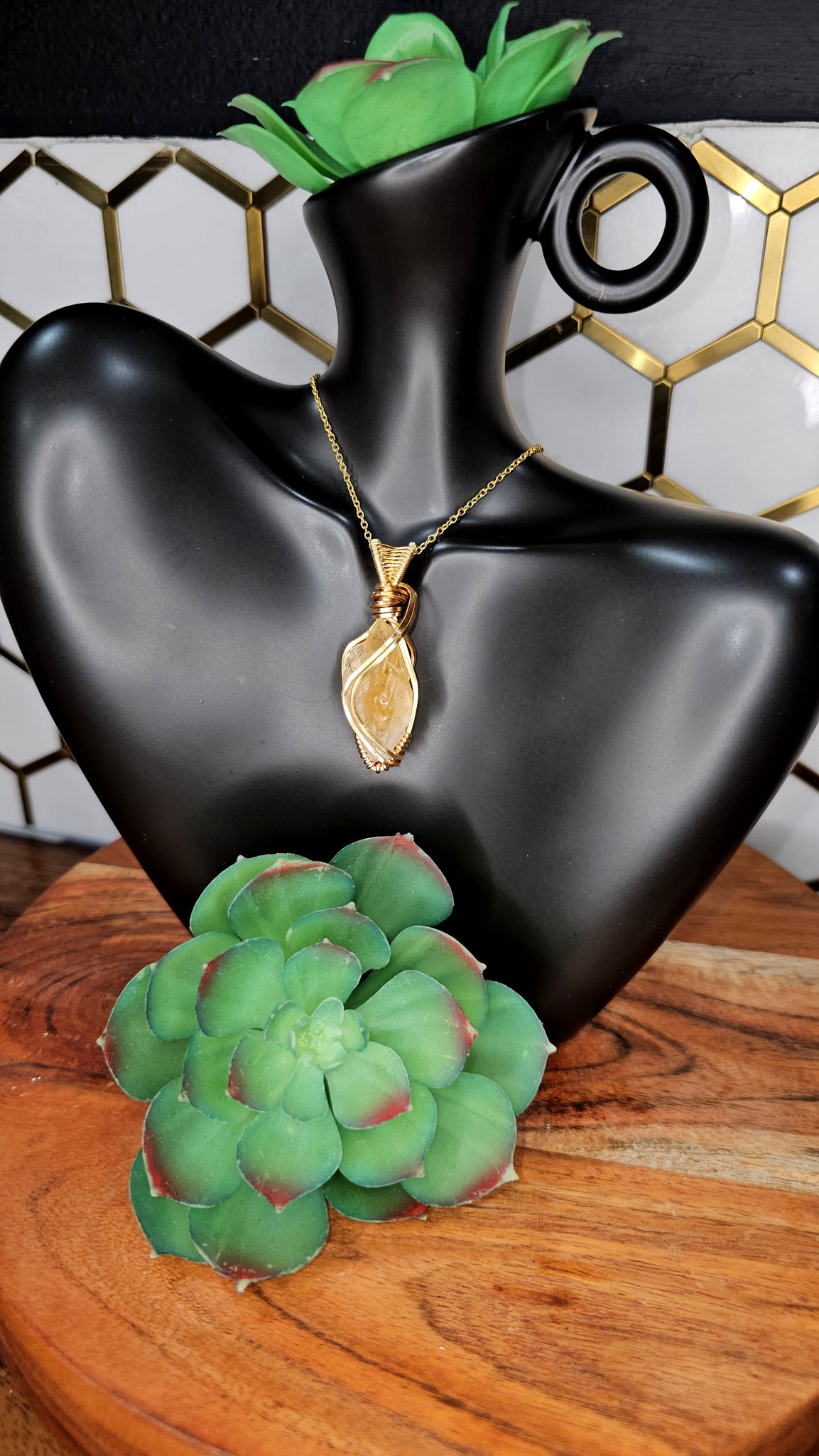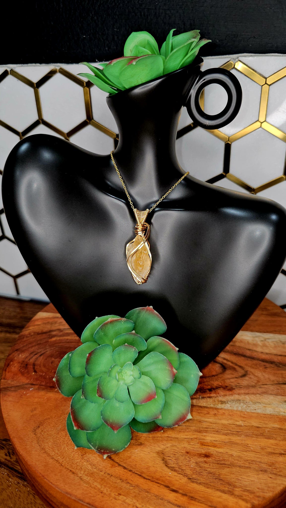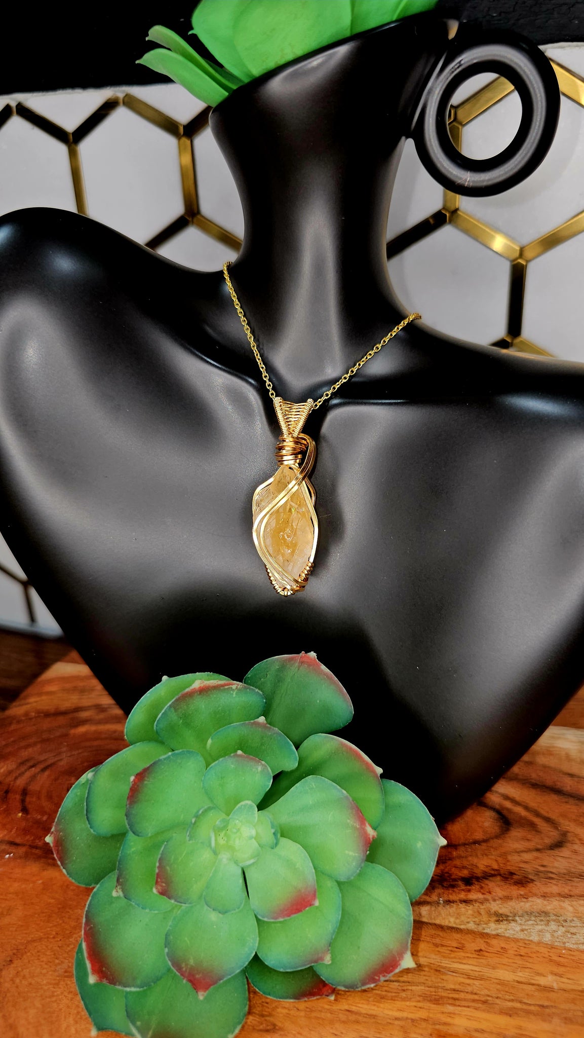 Citrine wrapped in gold coated copper wire. Comes with black waxed necklace cord or visit upgrade options for chains.