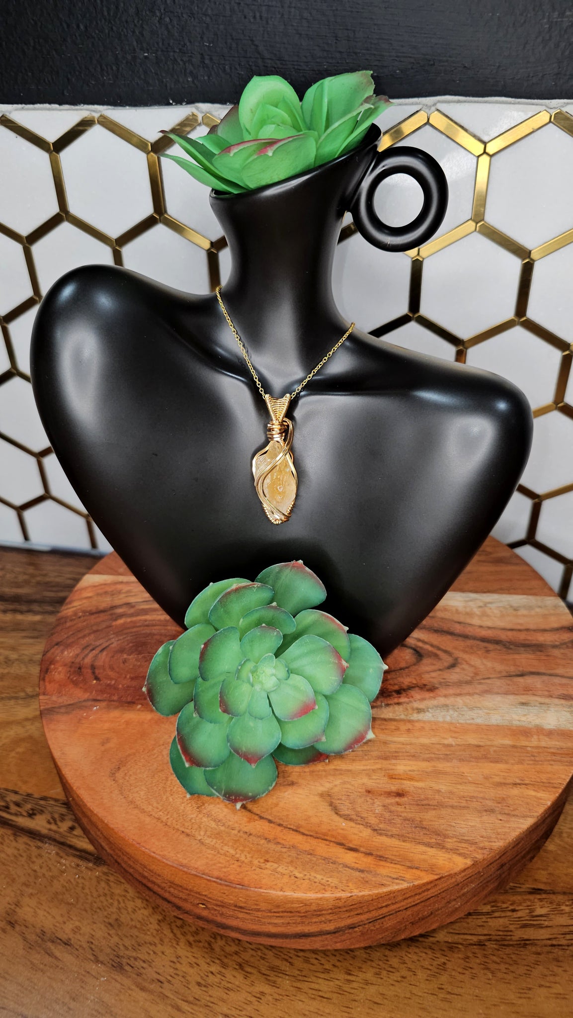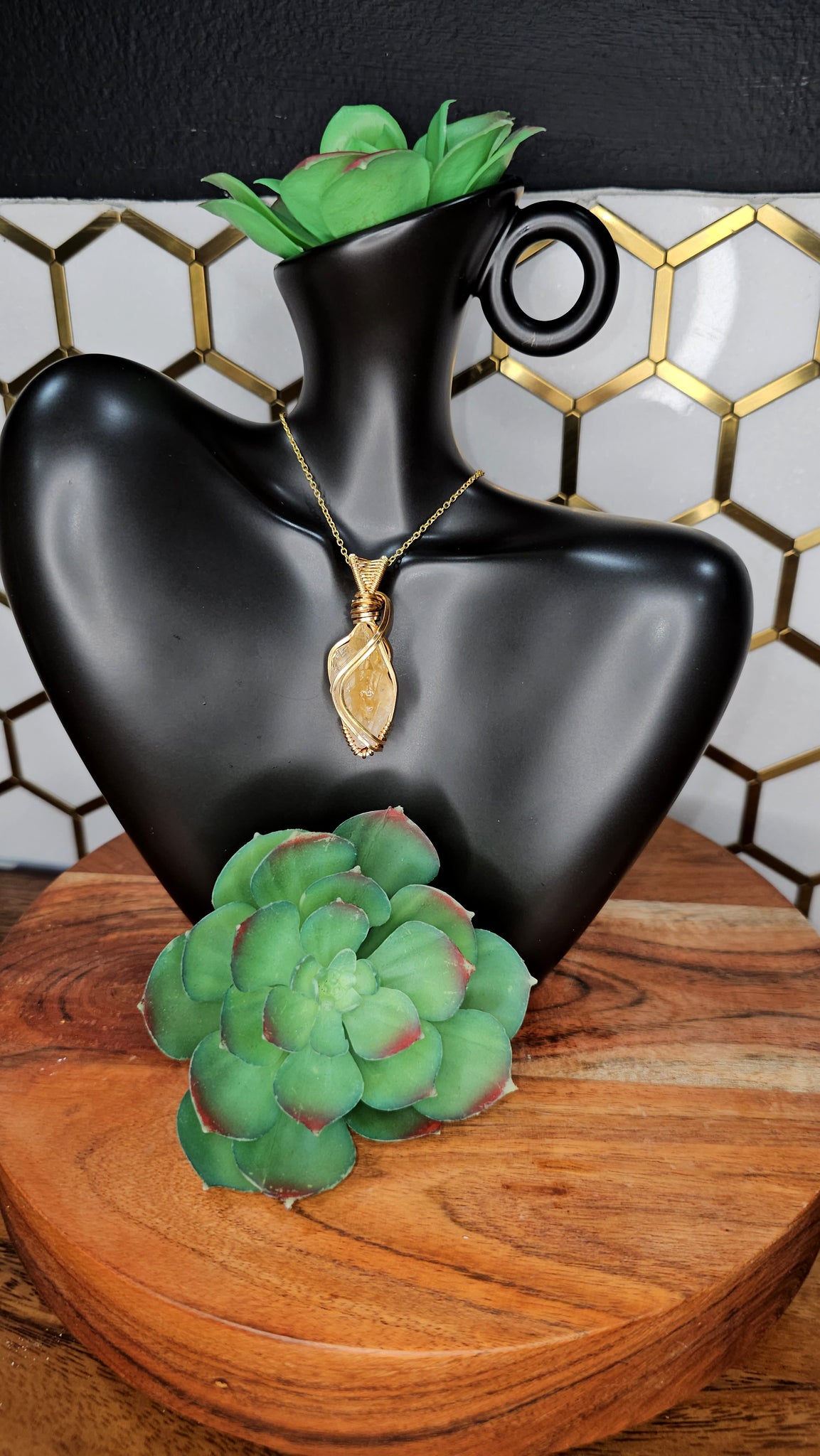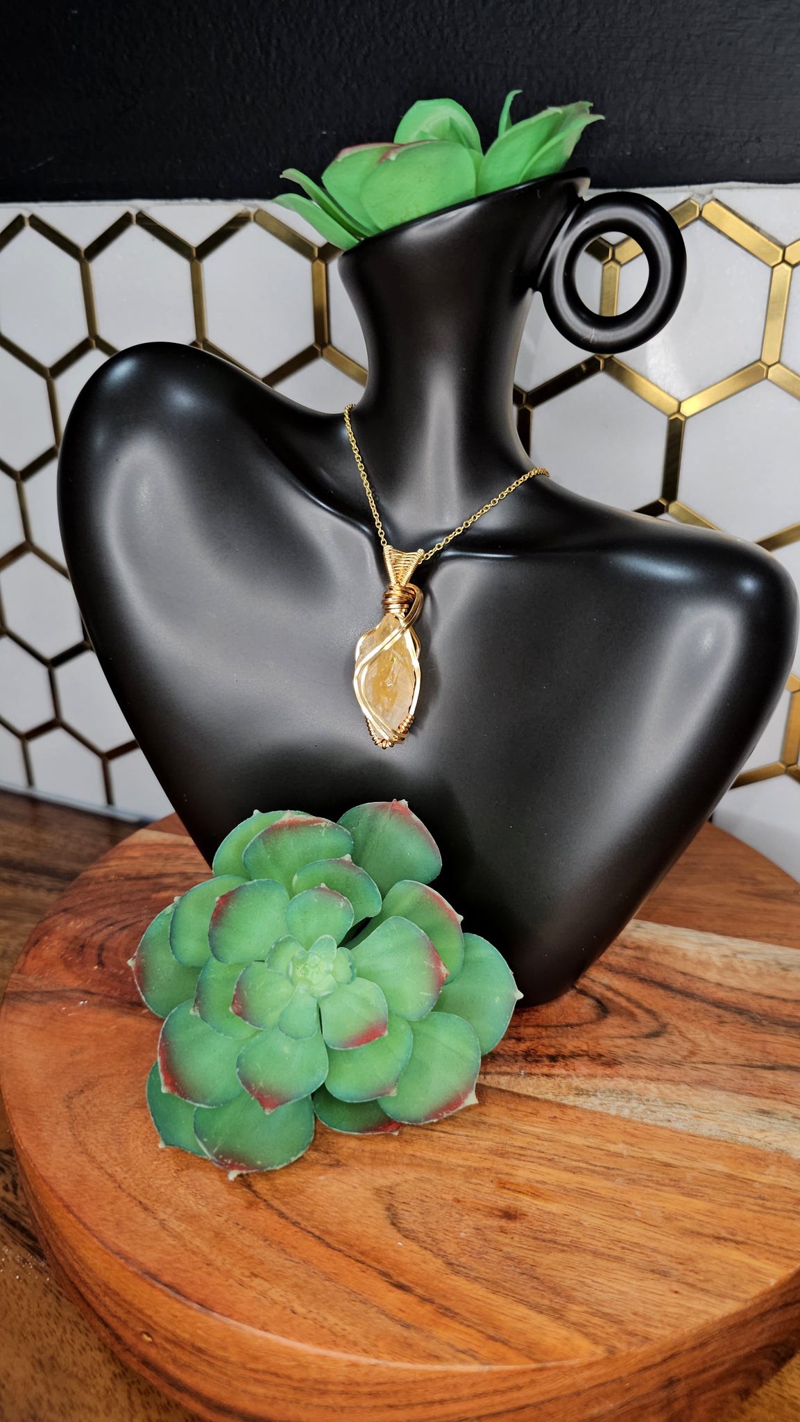 Citrine wrapped in gold coated copper wire. Comes with black waxed necklace cord or visit upgrade options for chains.