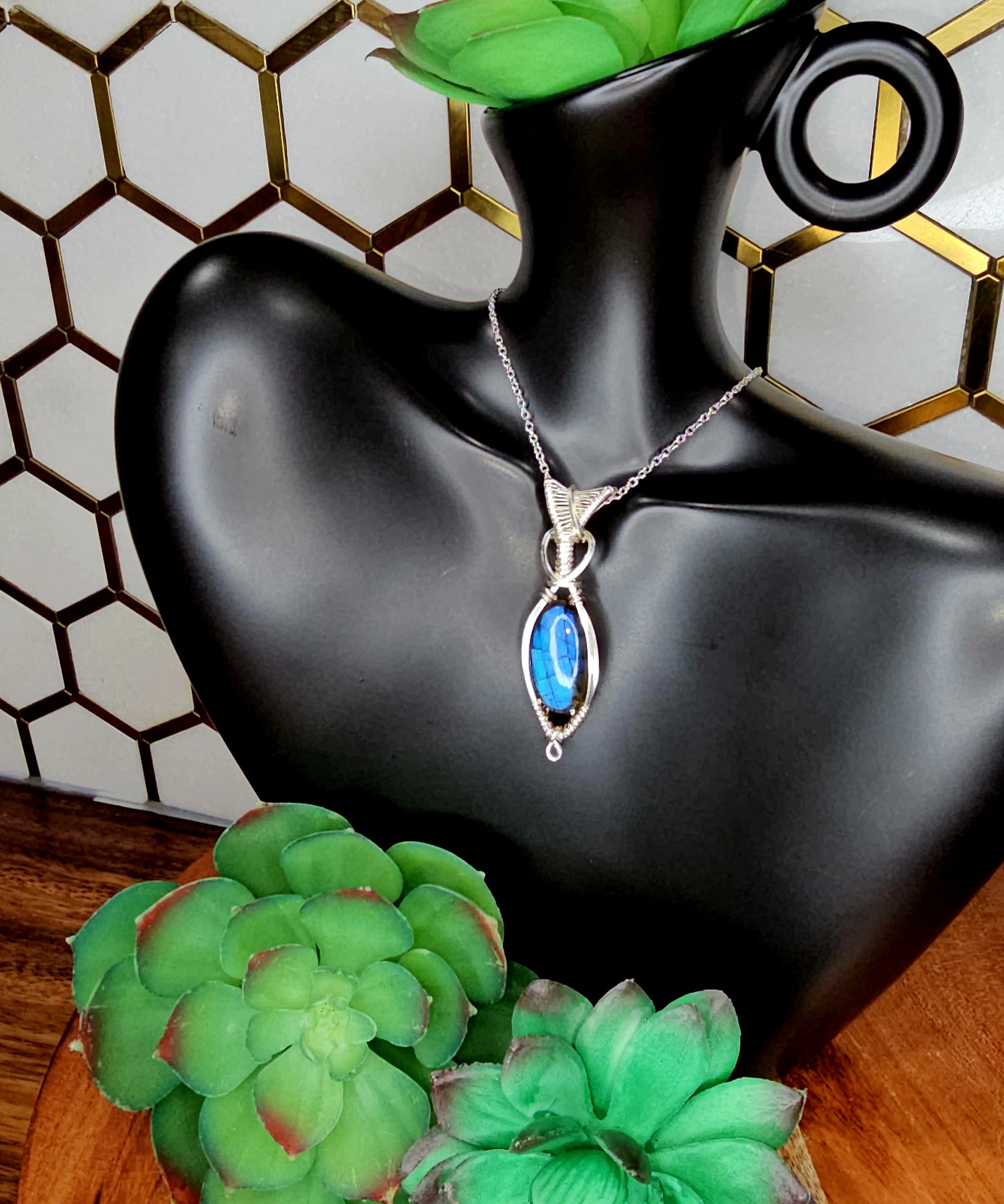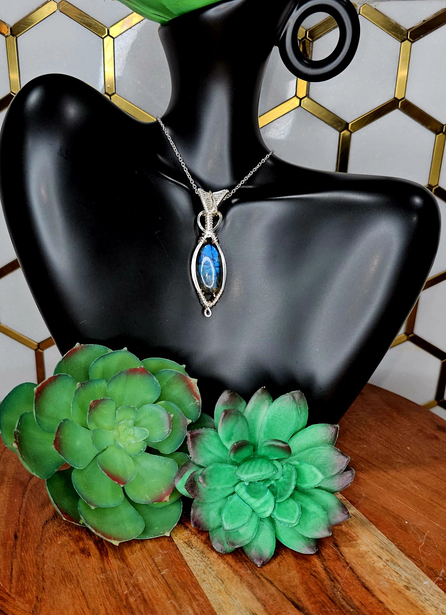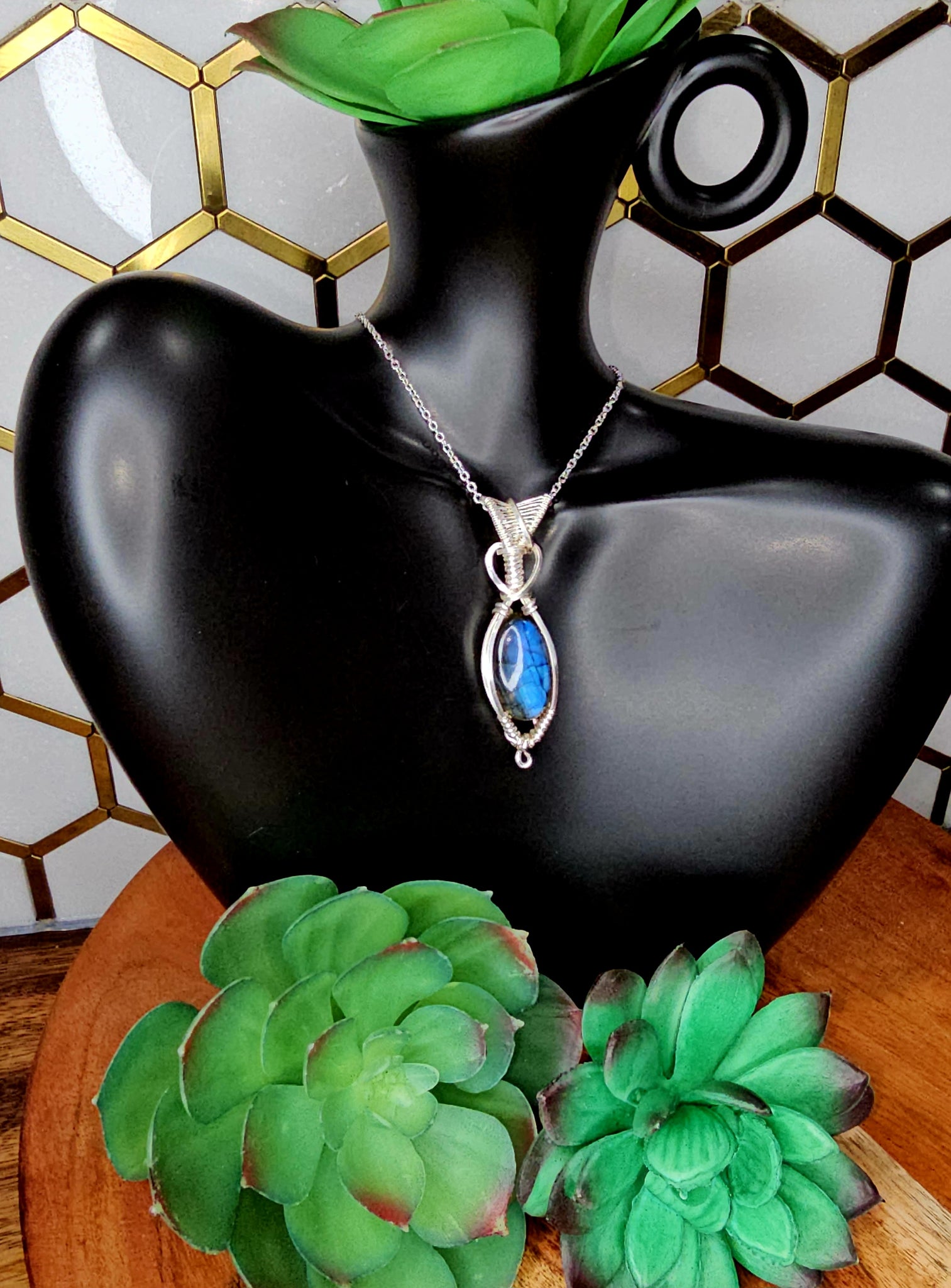 Labradorite pendant wrapped in gold coated copper wire.
