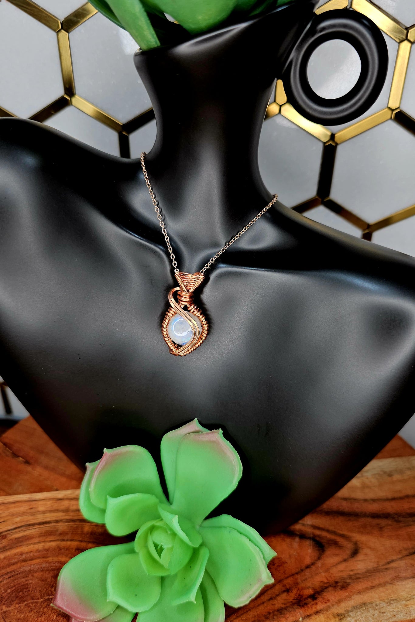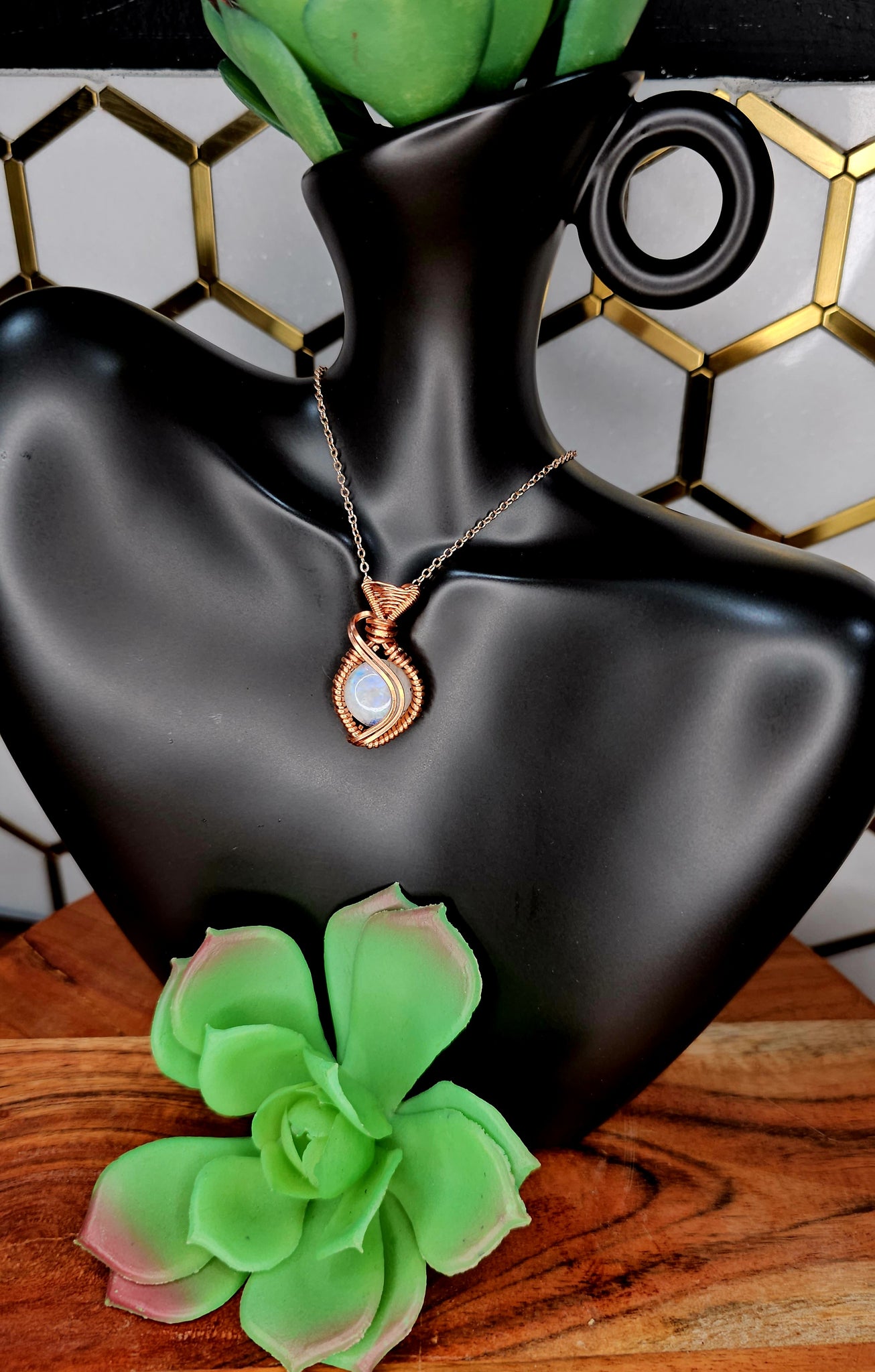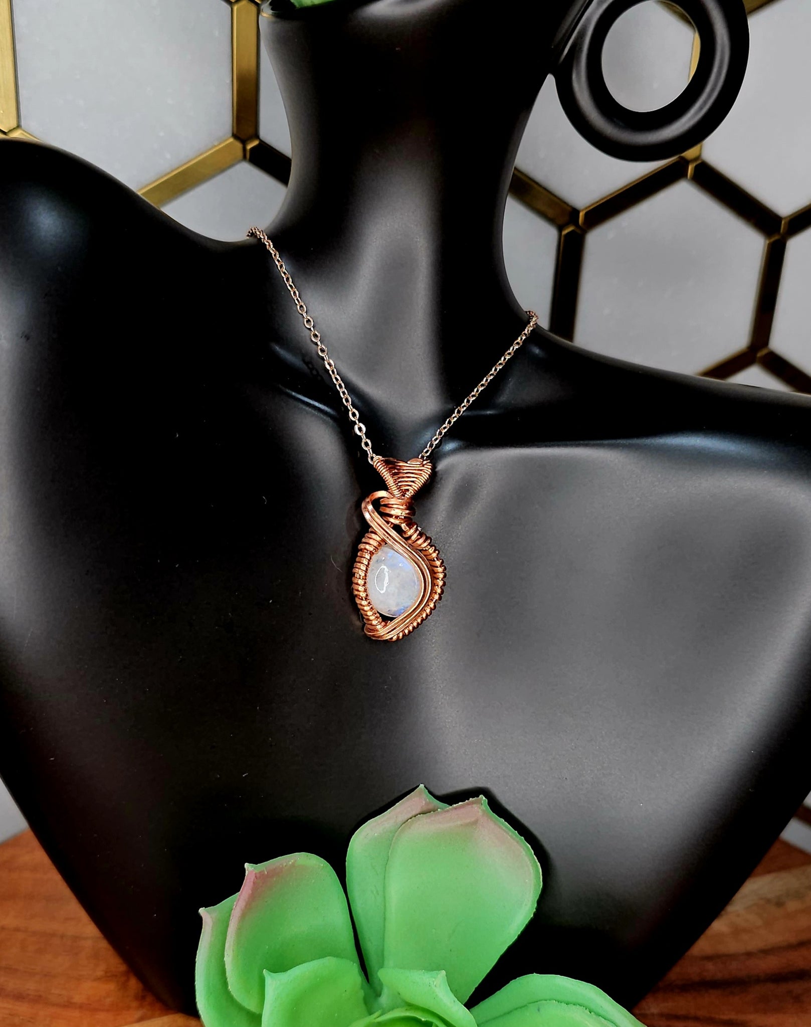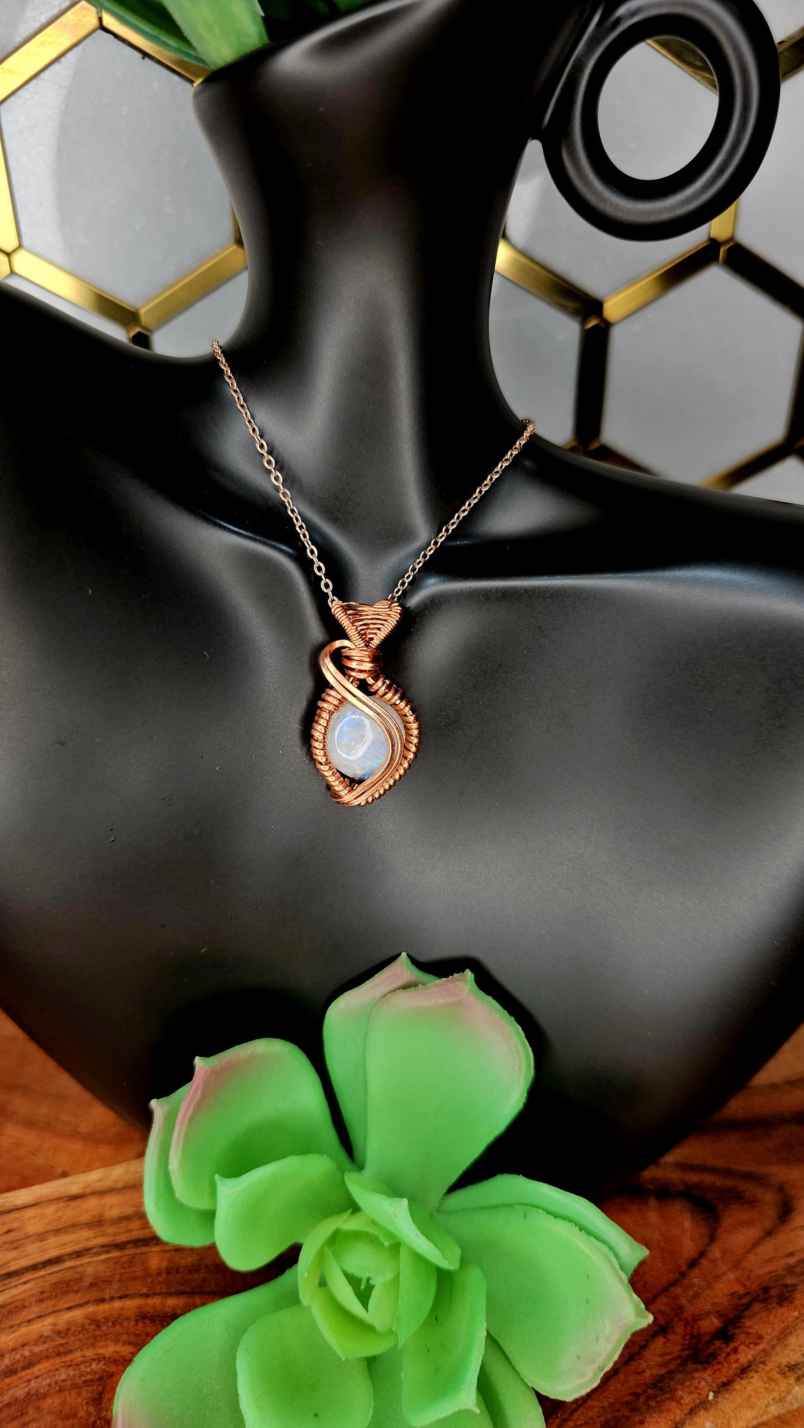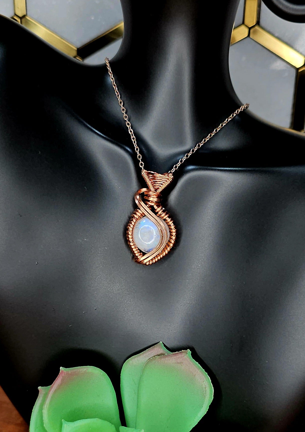 Moonstone wrapped in copper wire, comes with a black cord necklace.