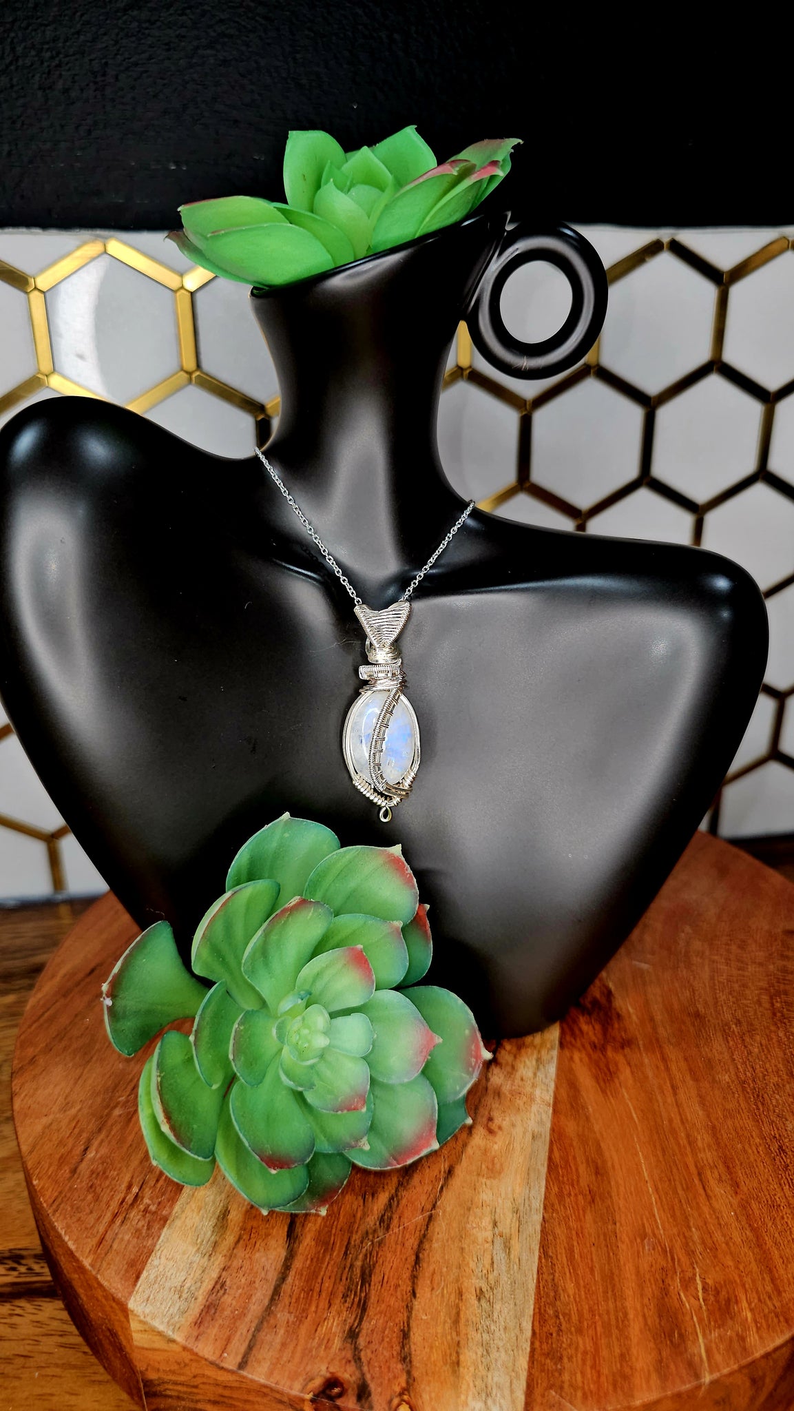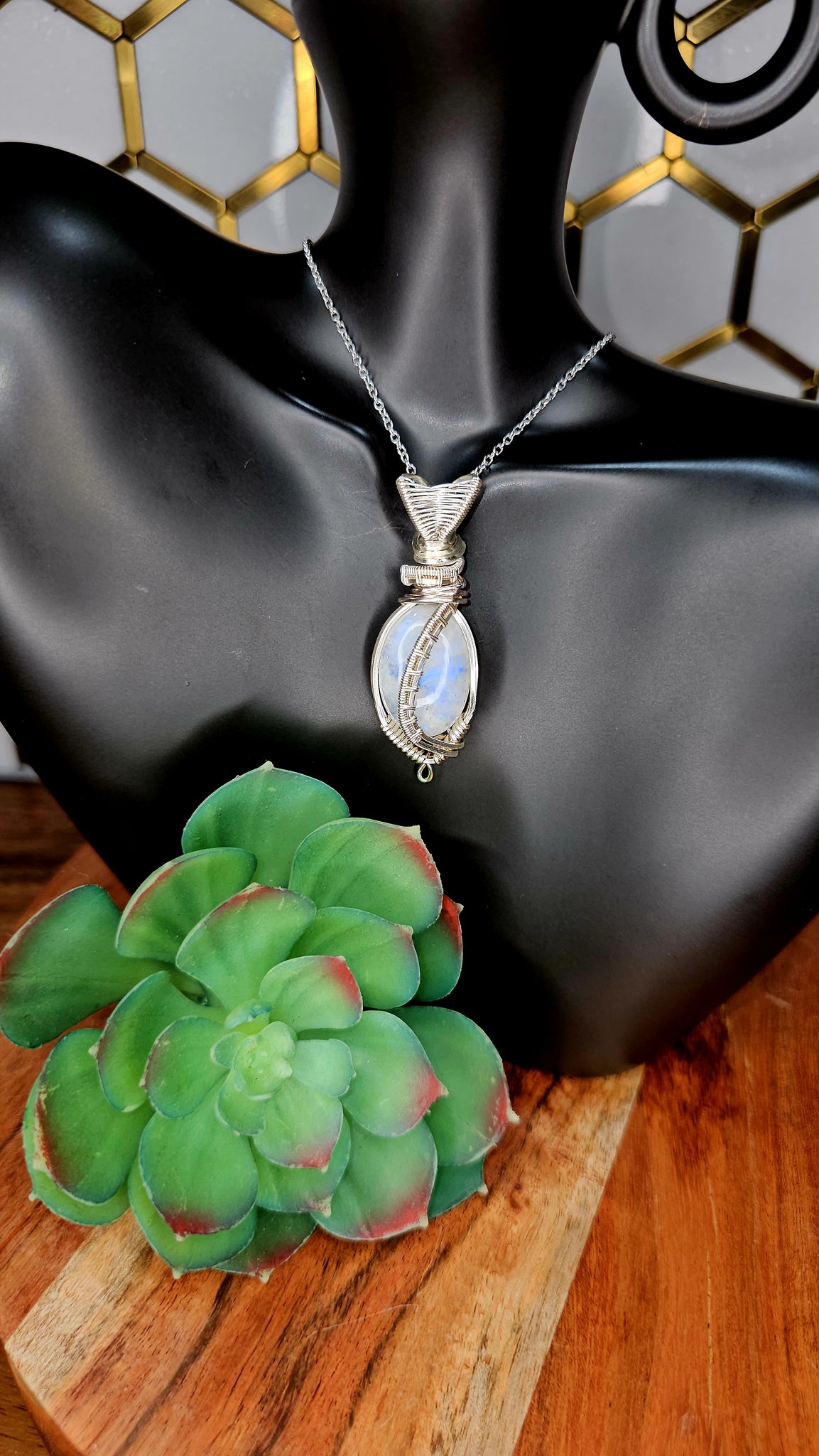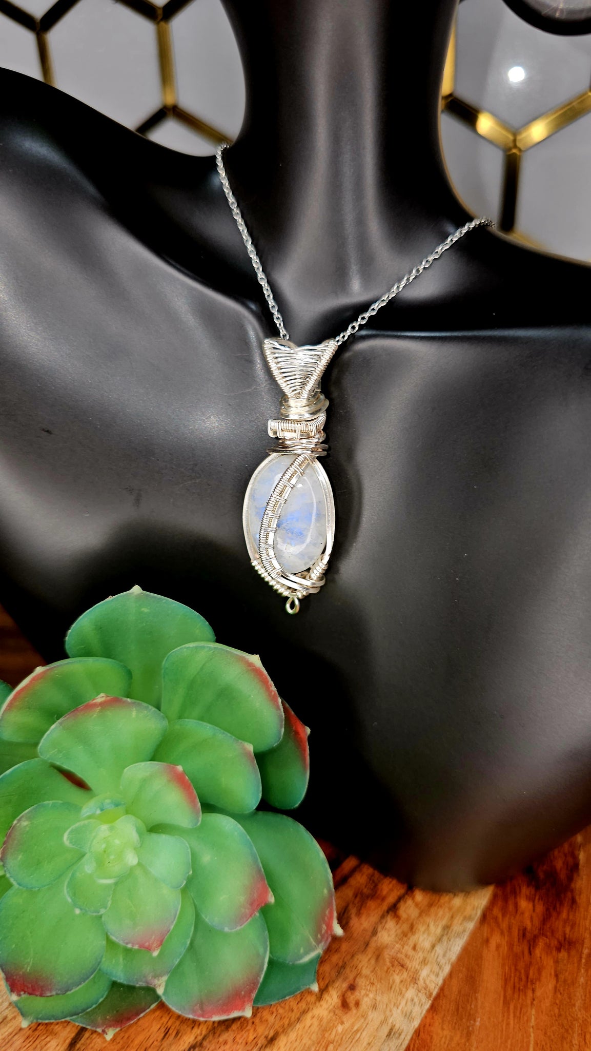 Moonstone wrapped in silver coated copper wire, comes with a black cord necklace.