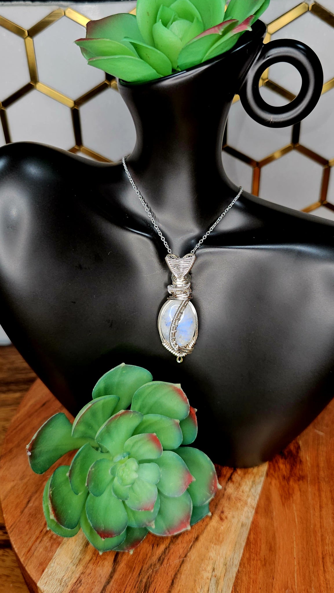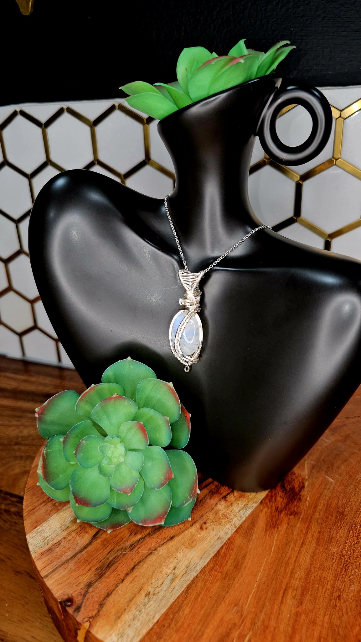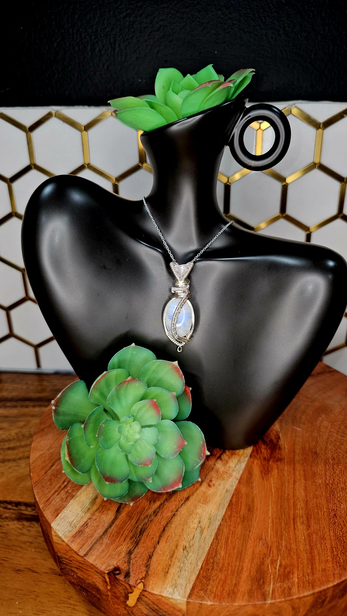 Moonstone wrapped in silver coated copper wire, comes with a black cord necklace.