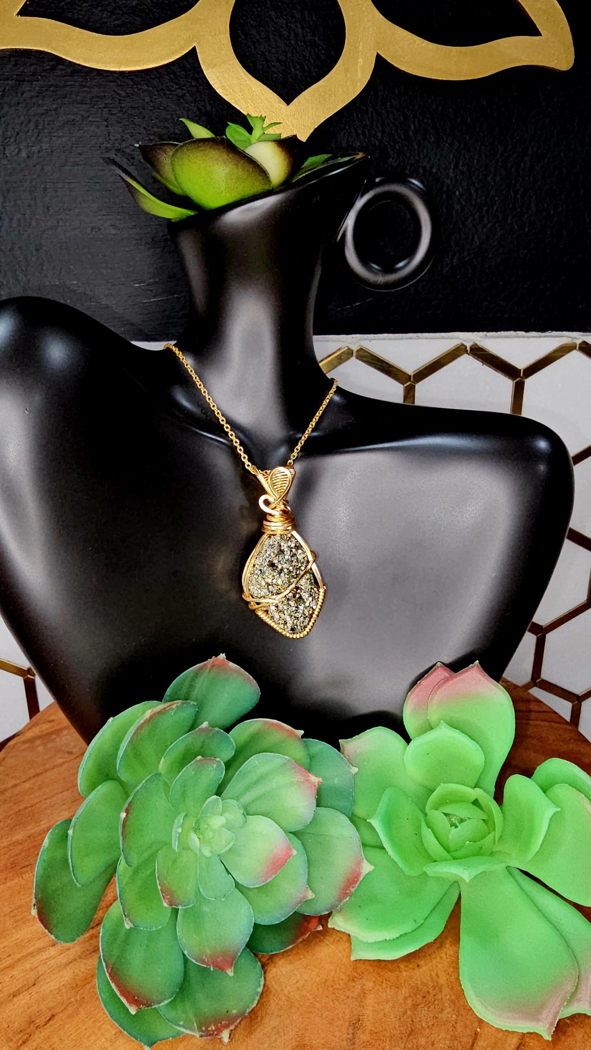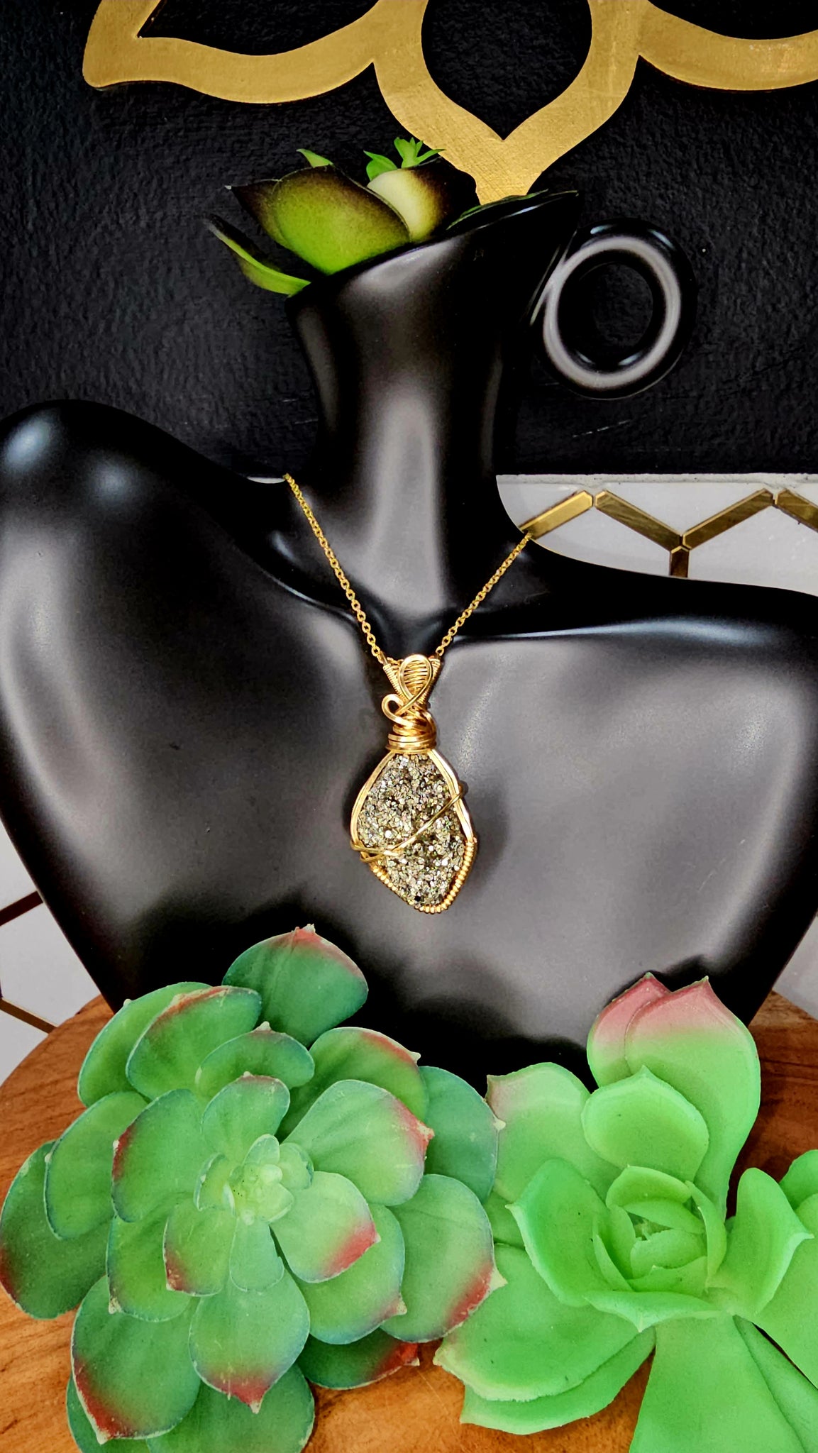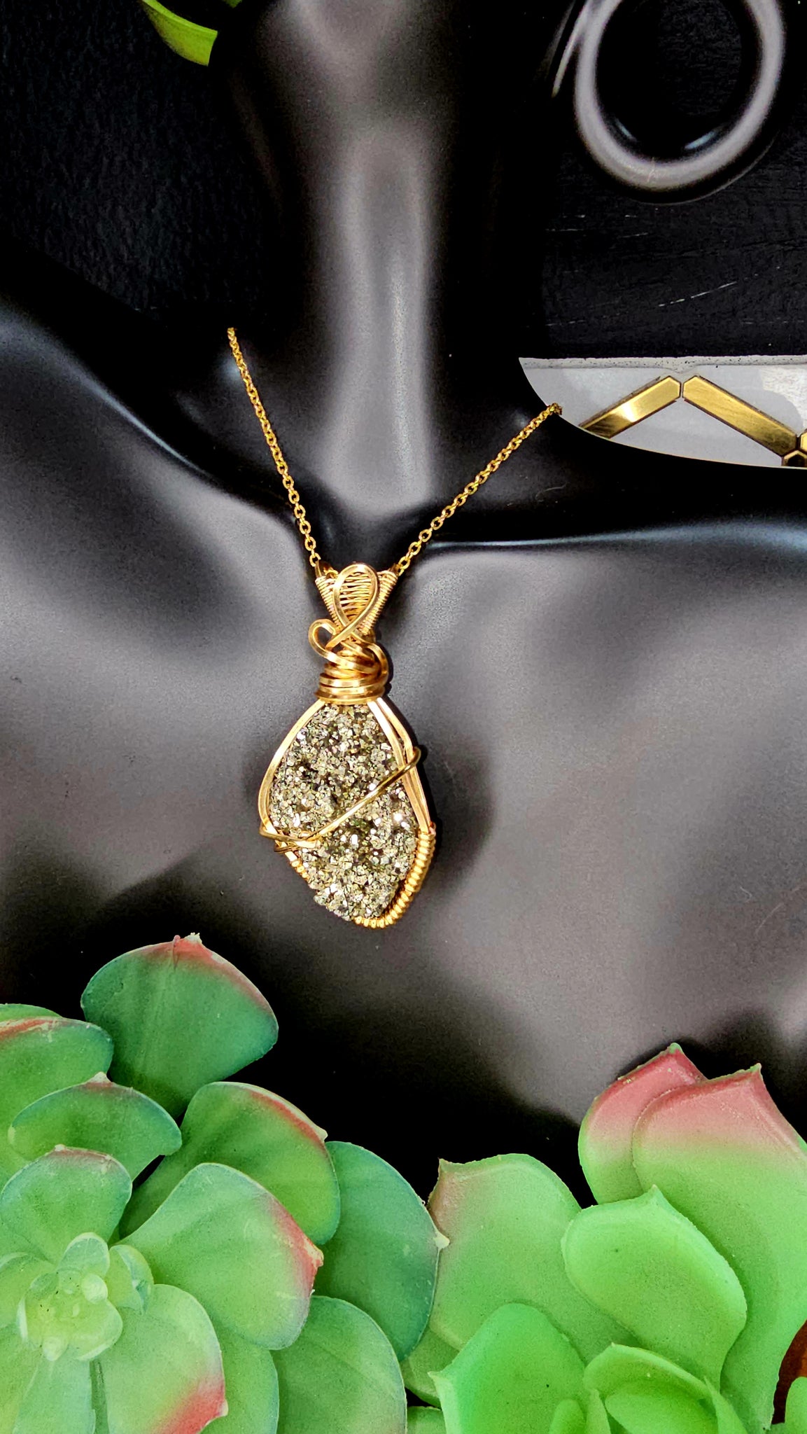 Pyrite pendant wrapped in gold wire. Comes with black waxed necklace cord.