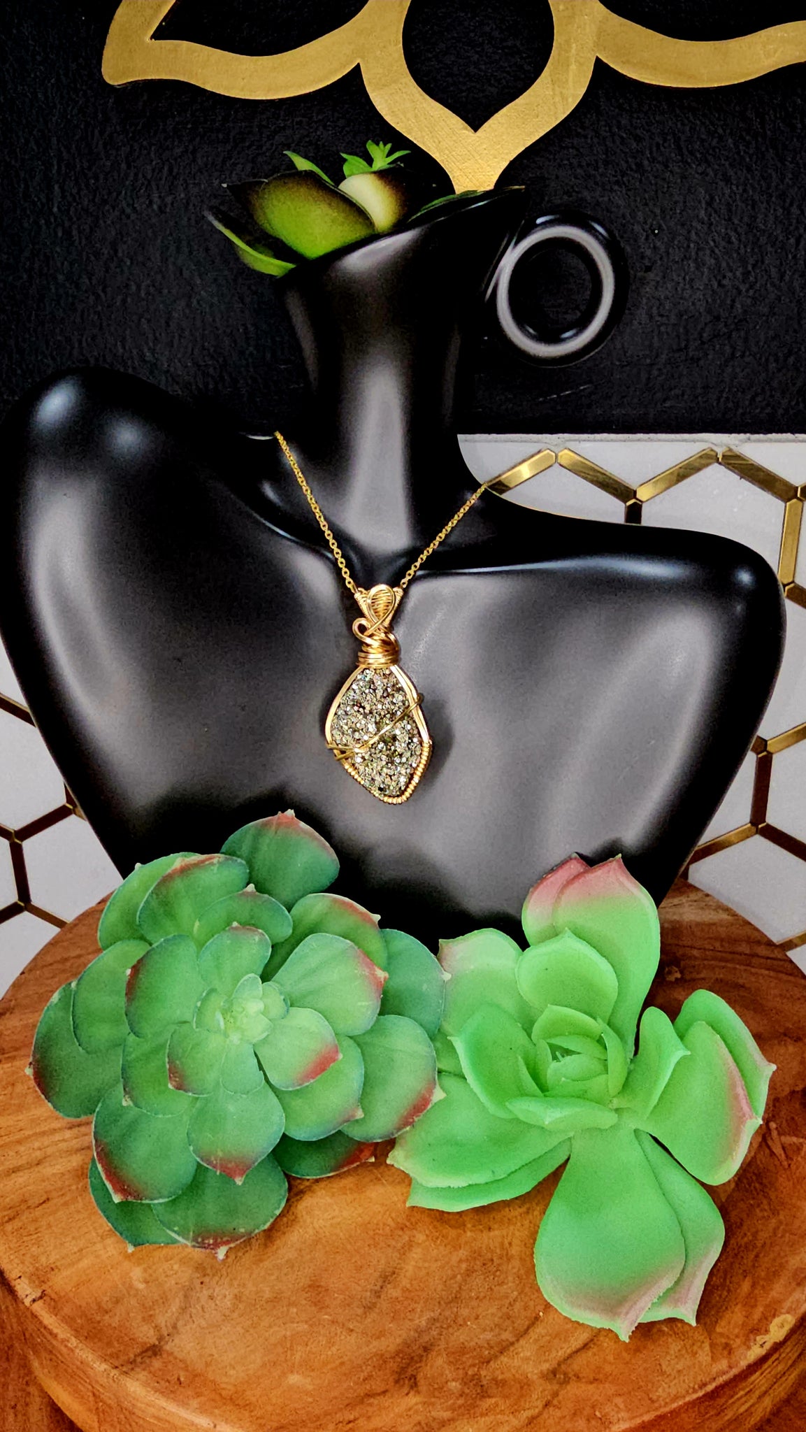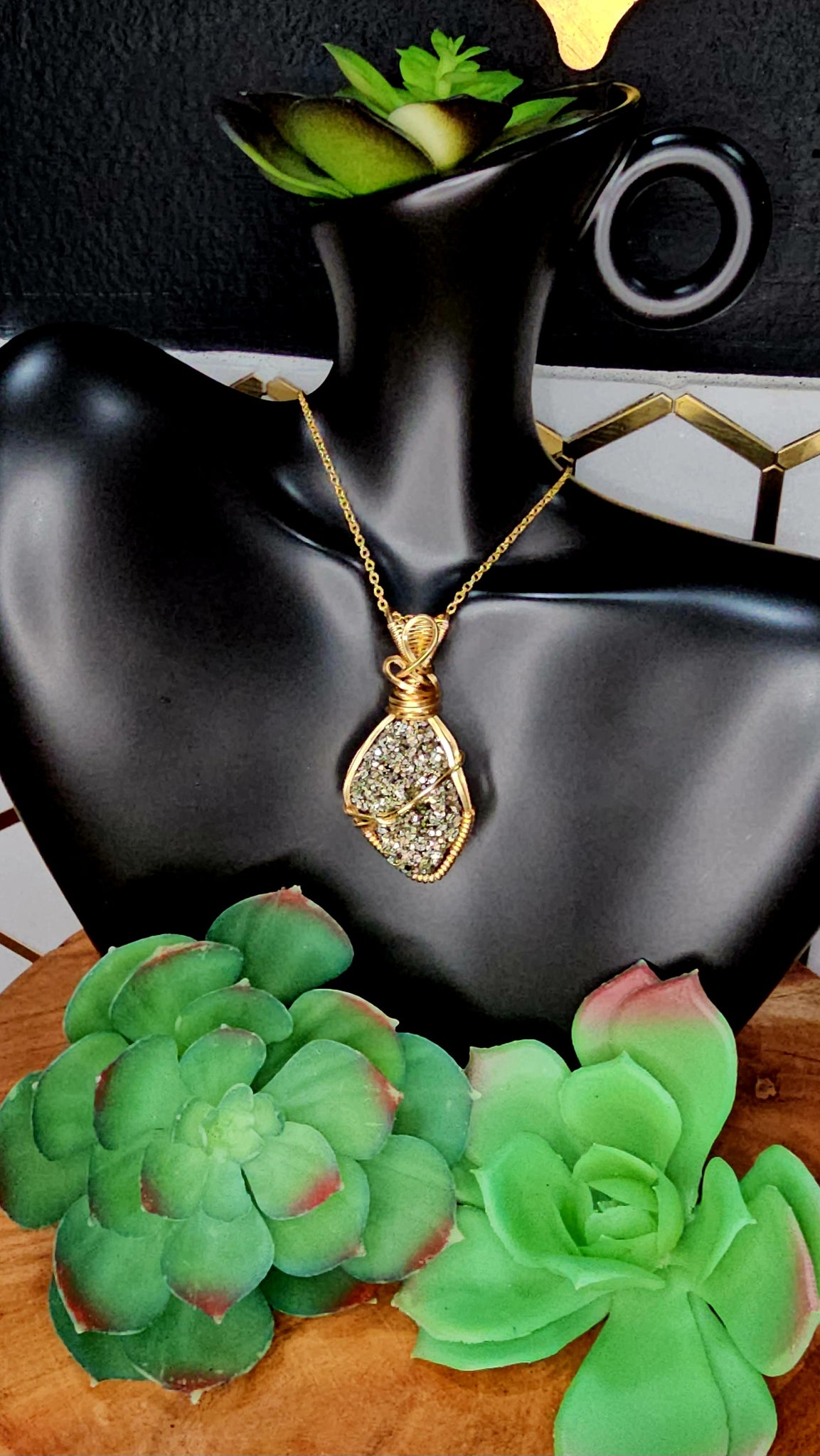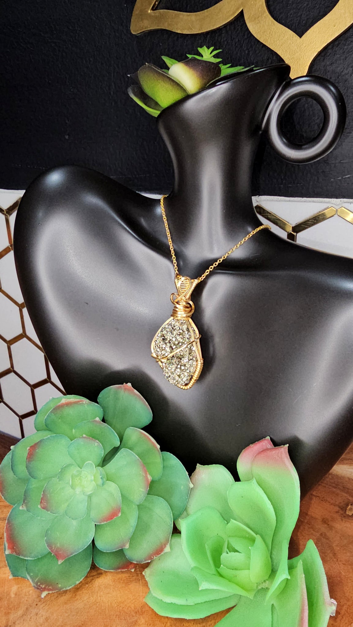 Pyrite pendant wrapped in gold wire. Comes with black waxed necklace cord.