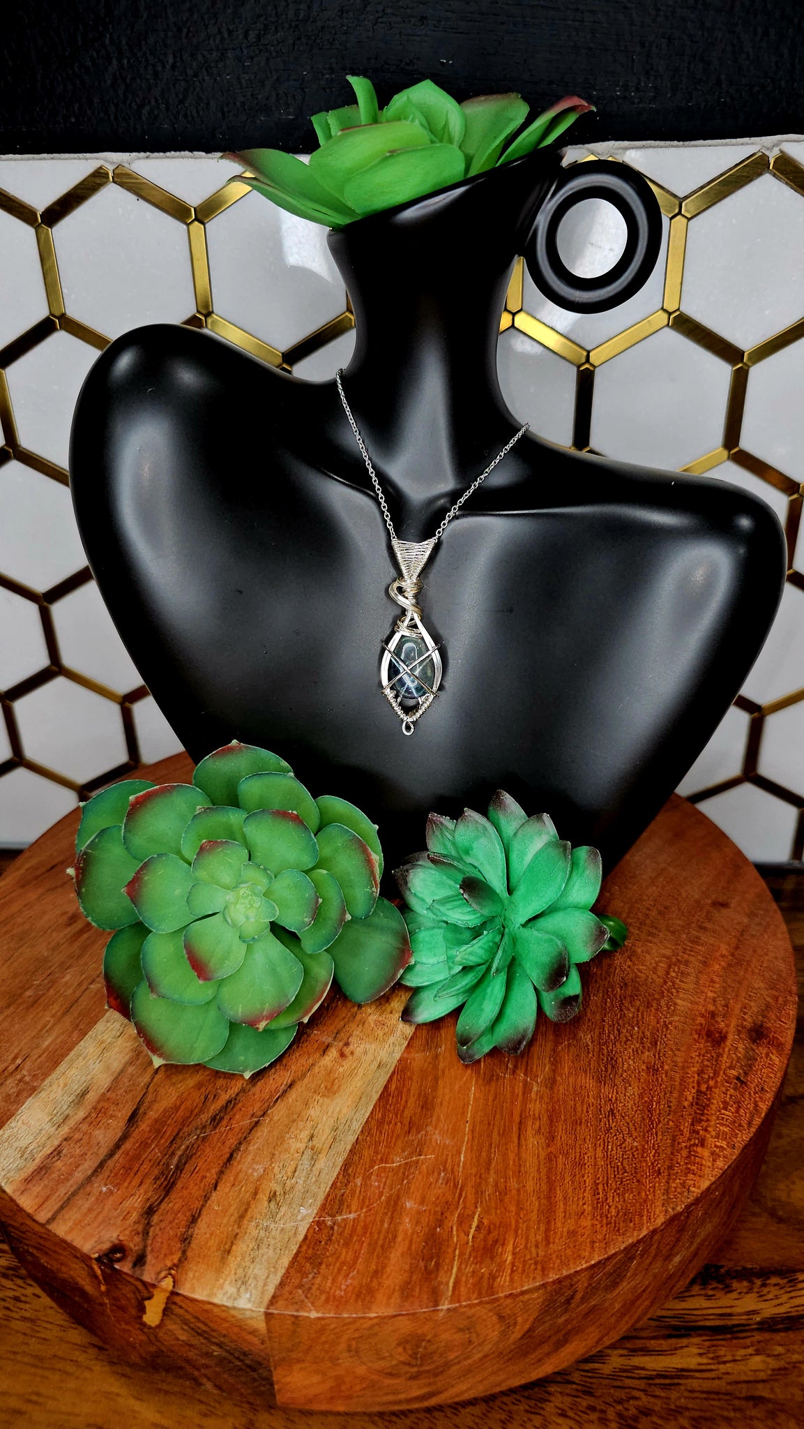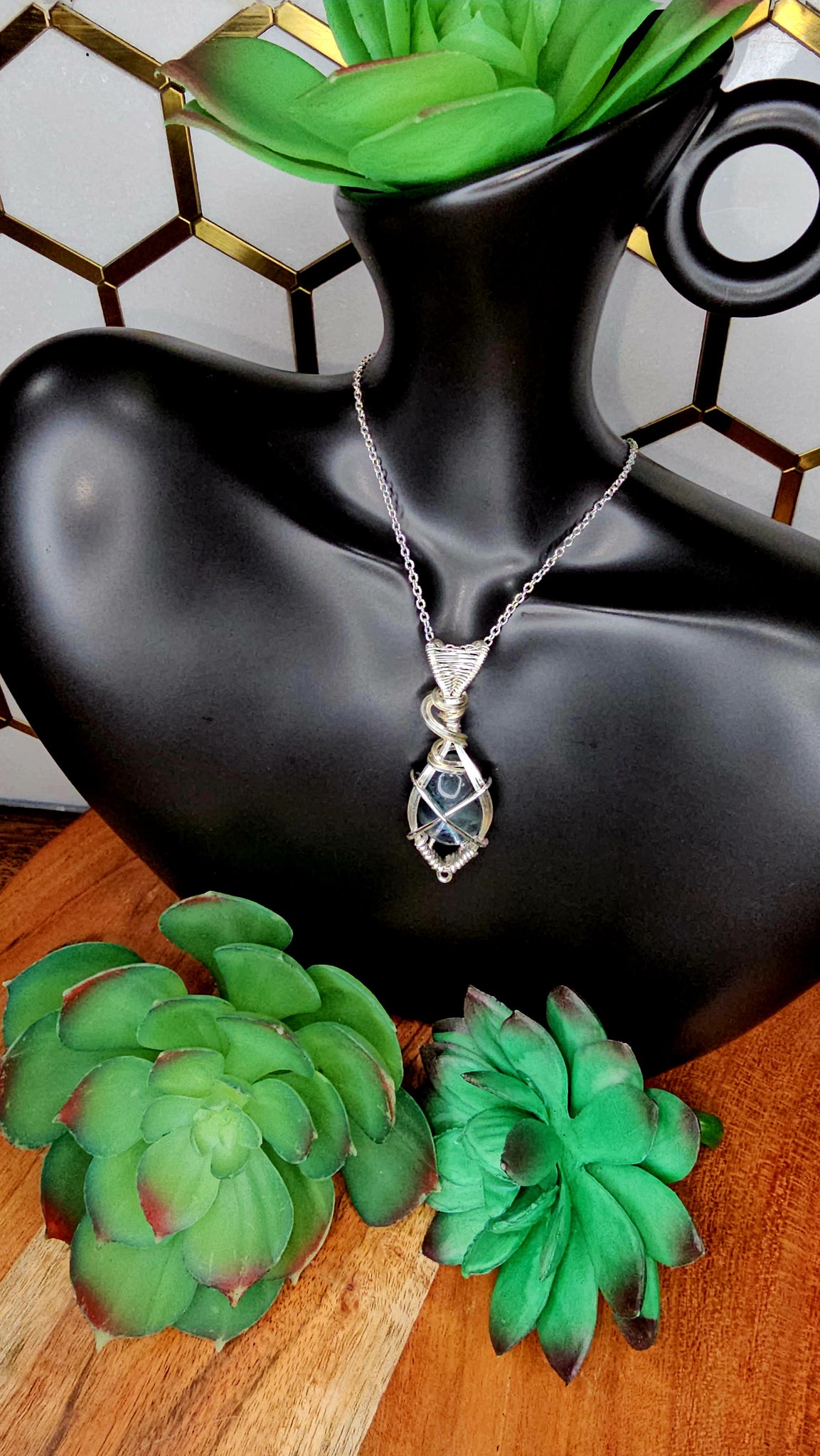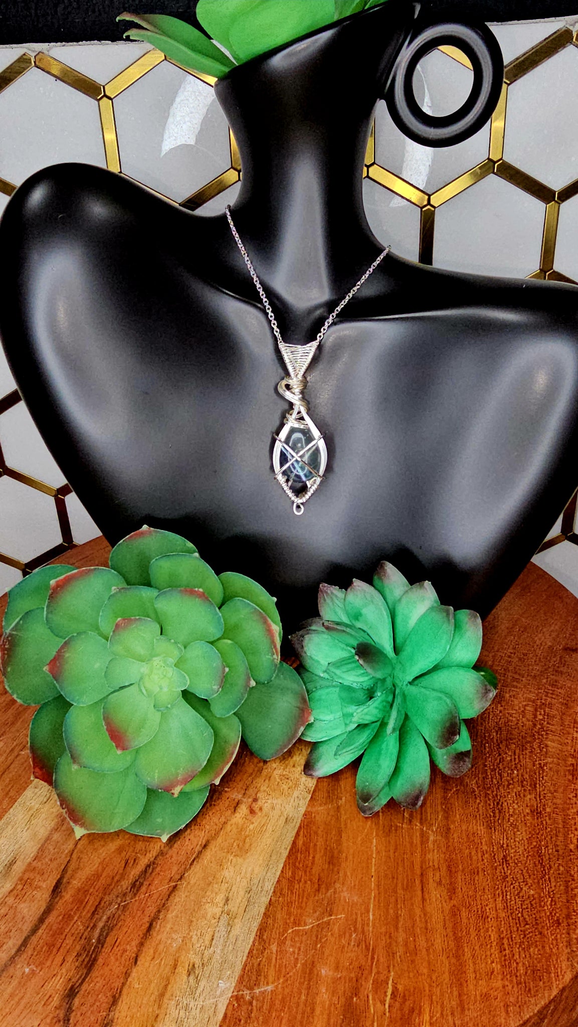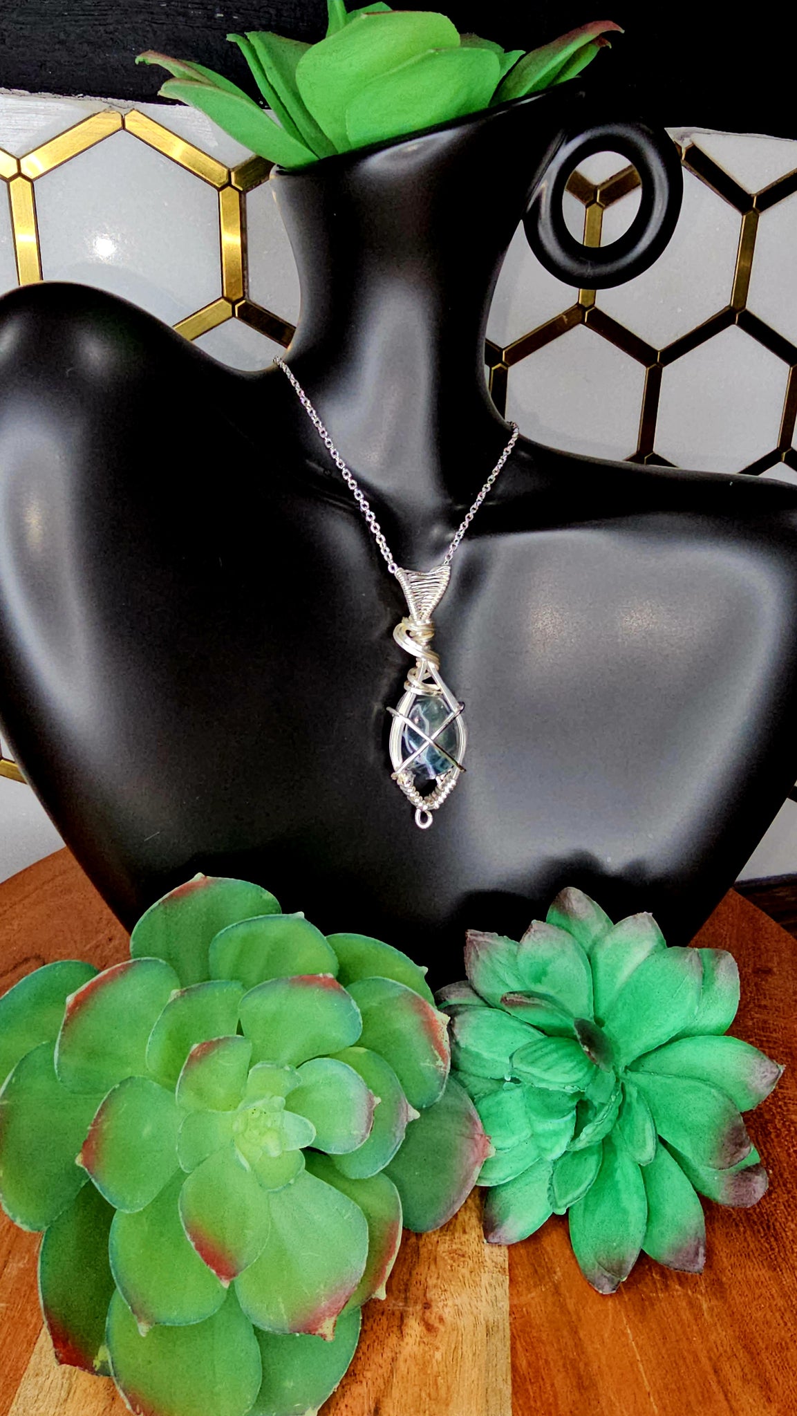 Fluorite wrapped in Silver crafts wire. Comes with a black cord necklace.