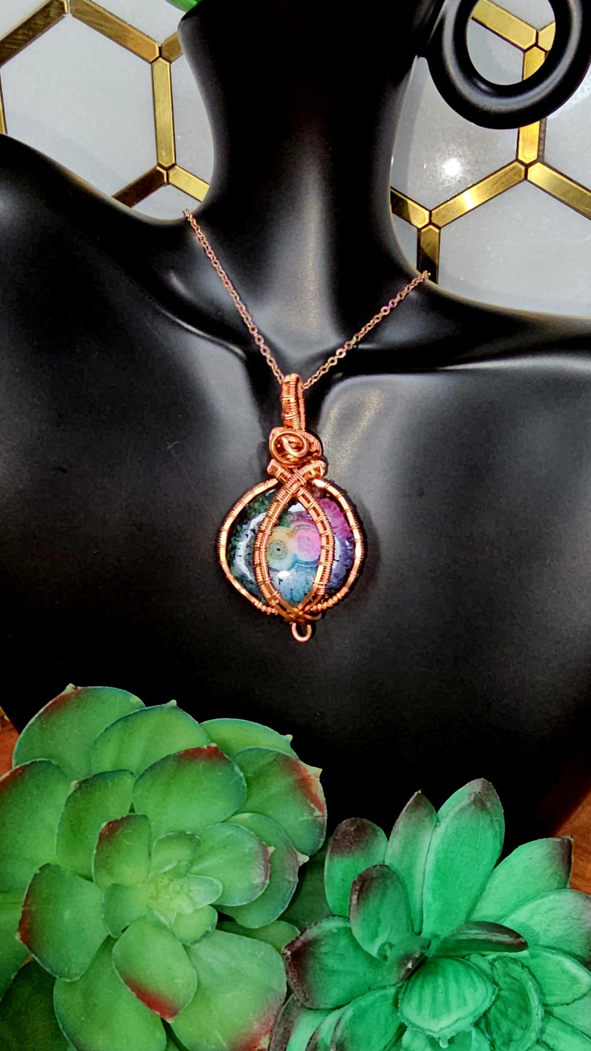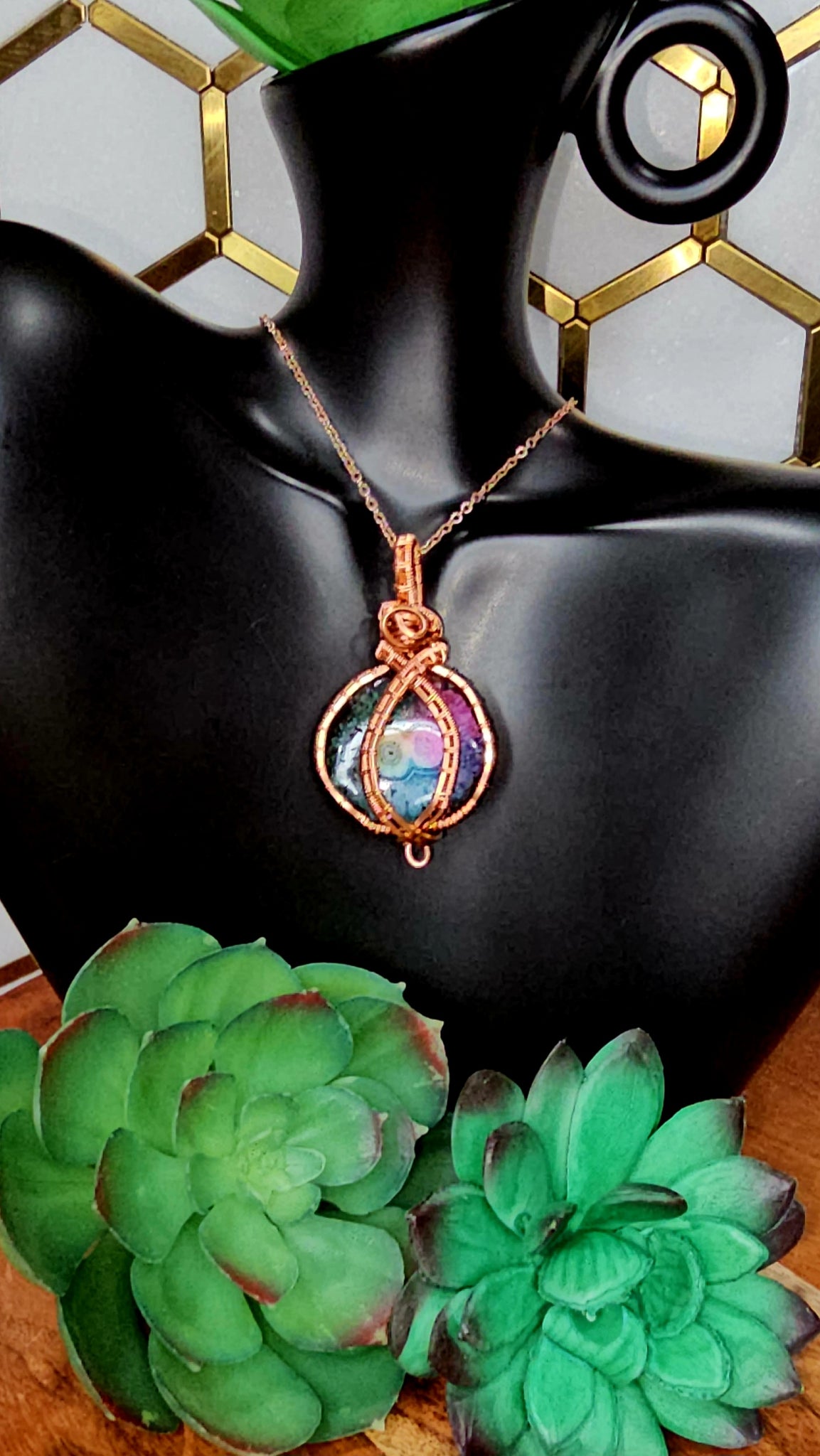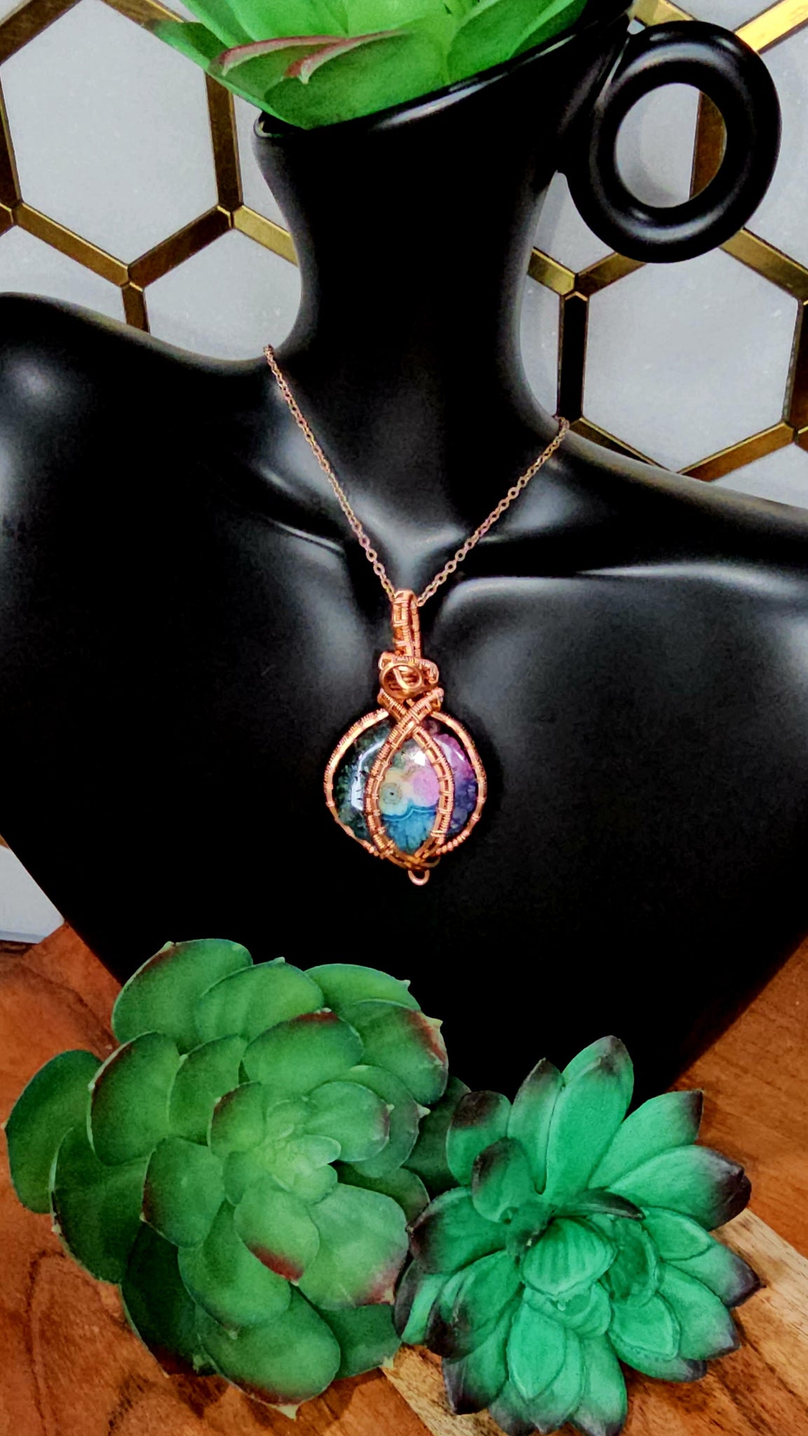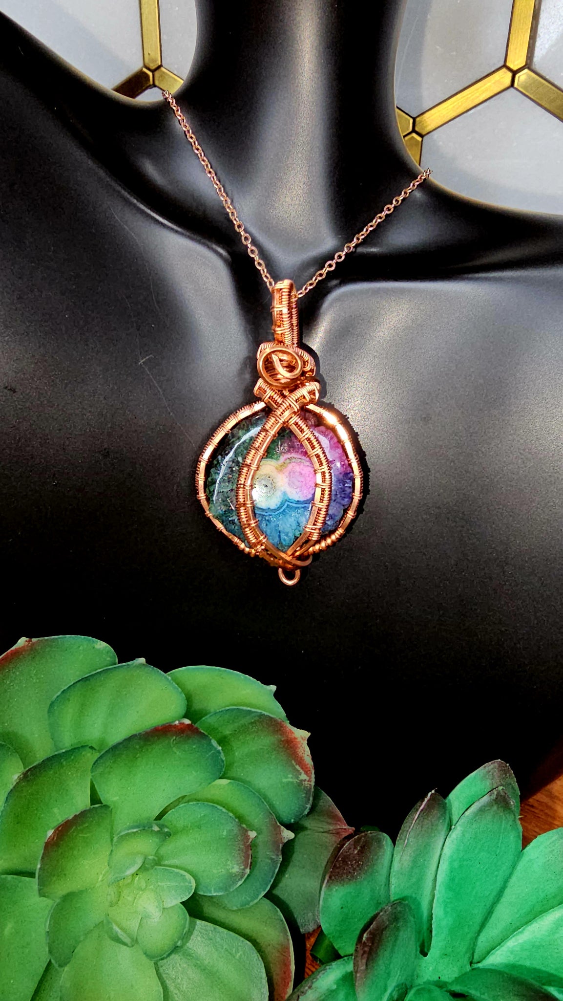 Solar quartz pendant wrapped in copper wire comes with a black cord necklace.