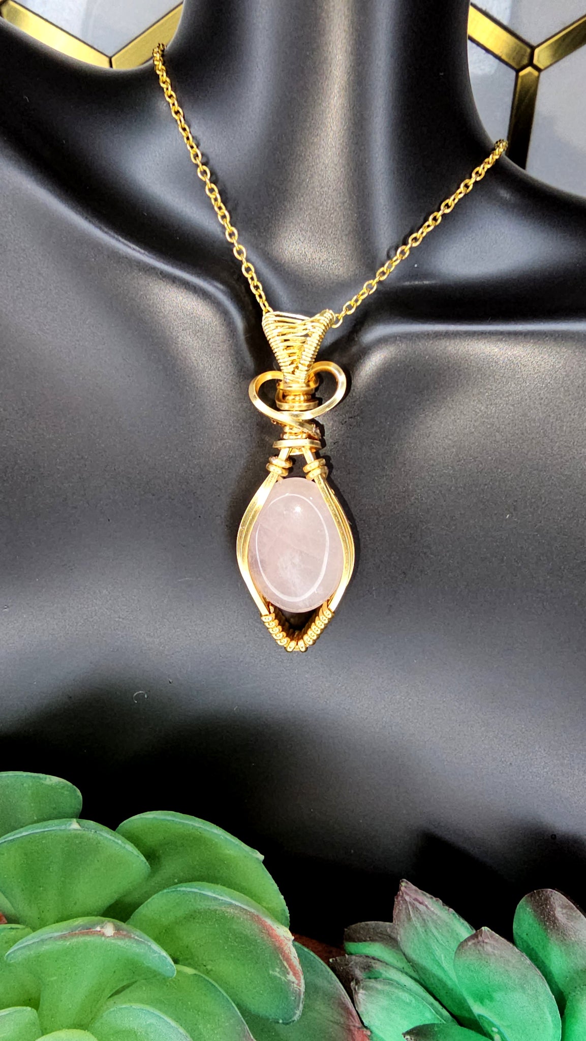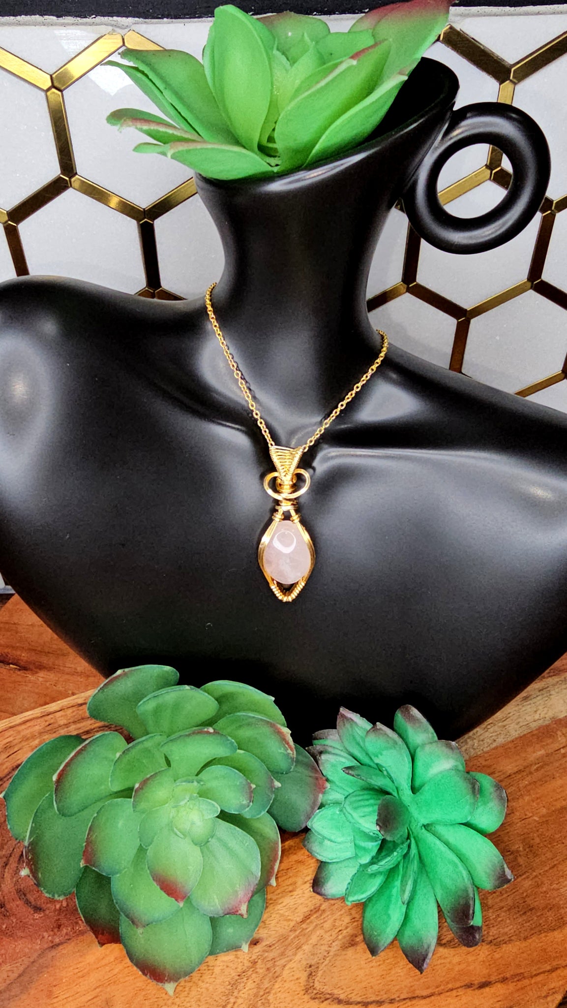 Rose Quartz Pendant wrapped in Gold craft wire. Comes with a black cord necklace but will fit on most chains of your choosing.