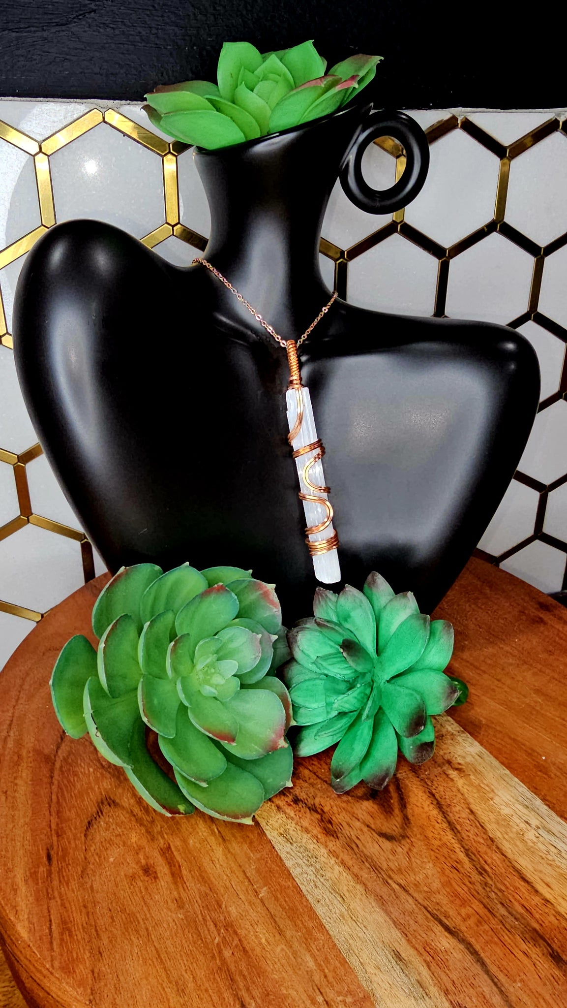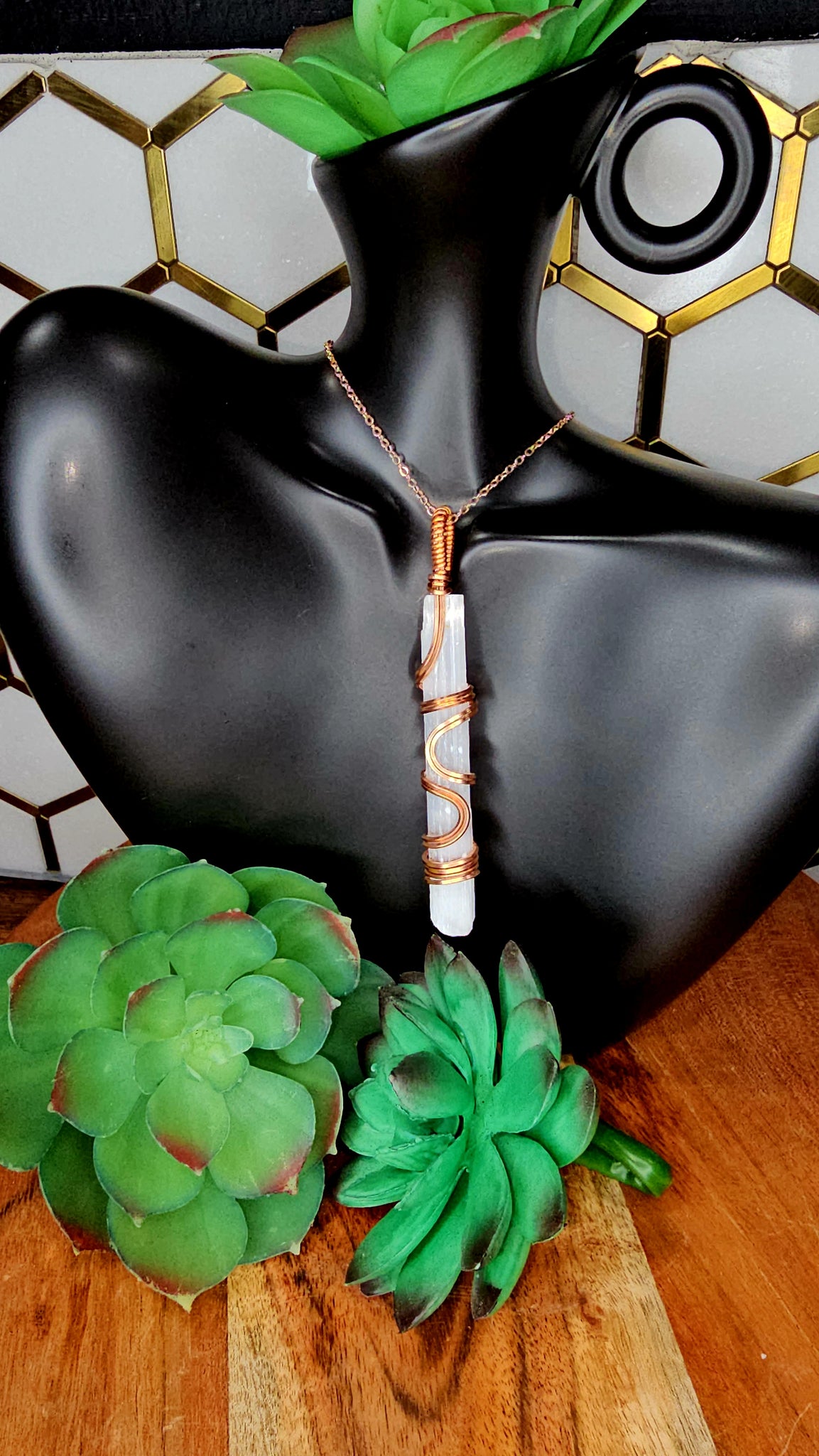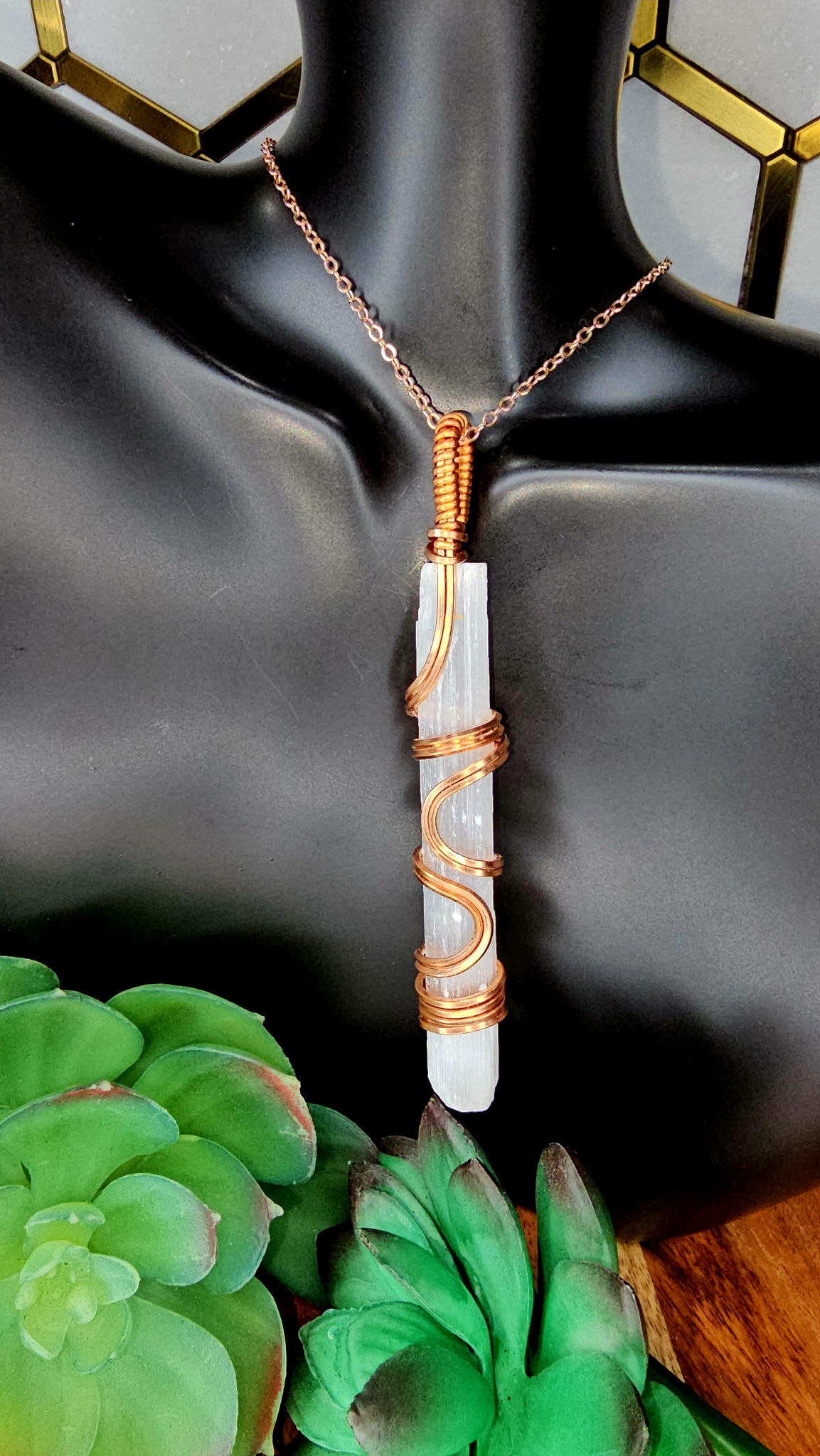 Selenite wrapped in copper wire. Comes with a black cord. See upgrade options for chains.
