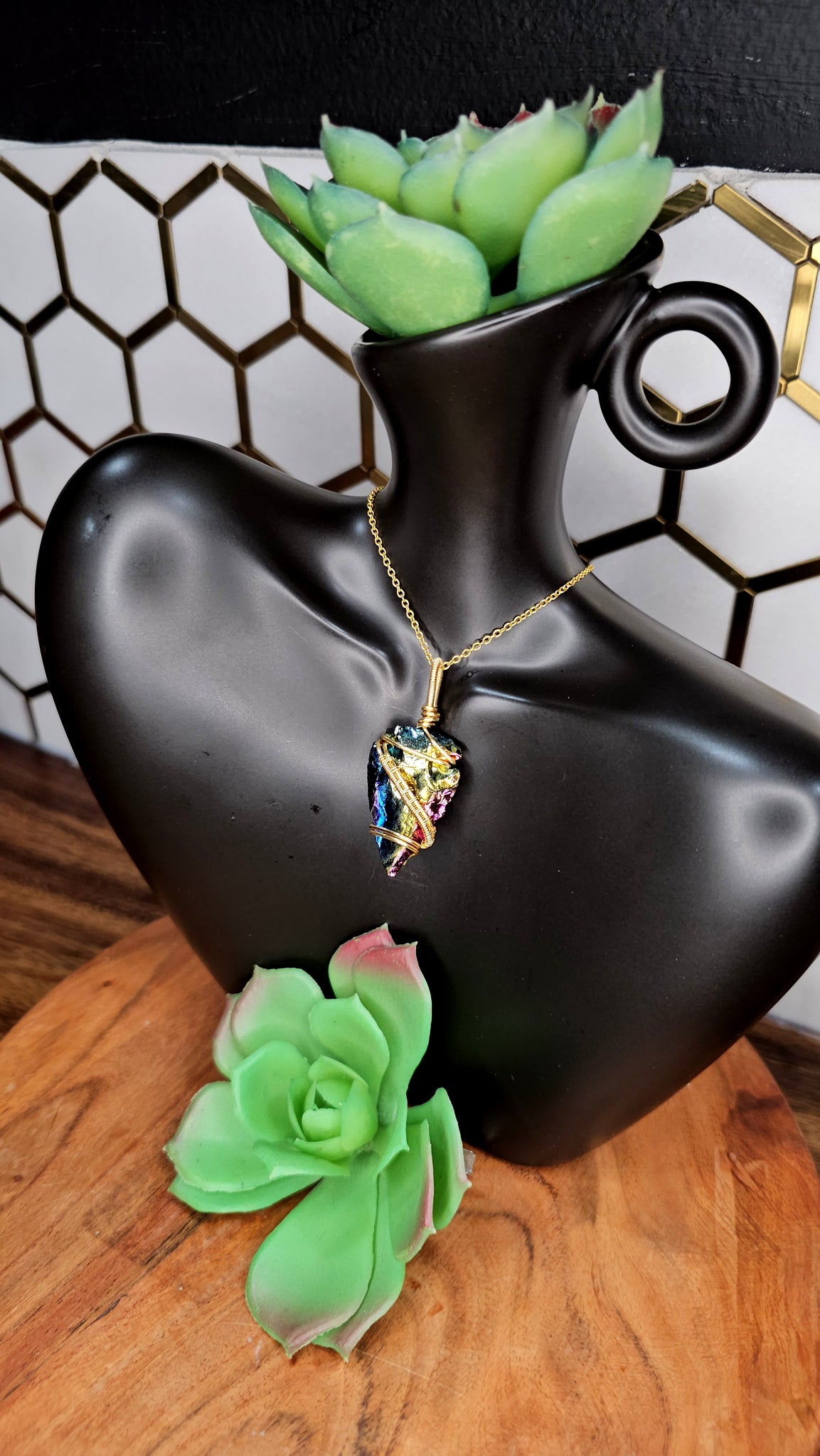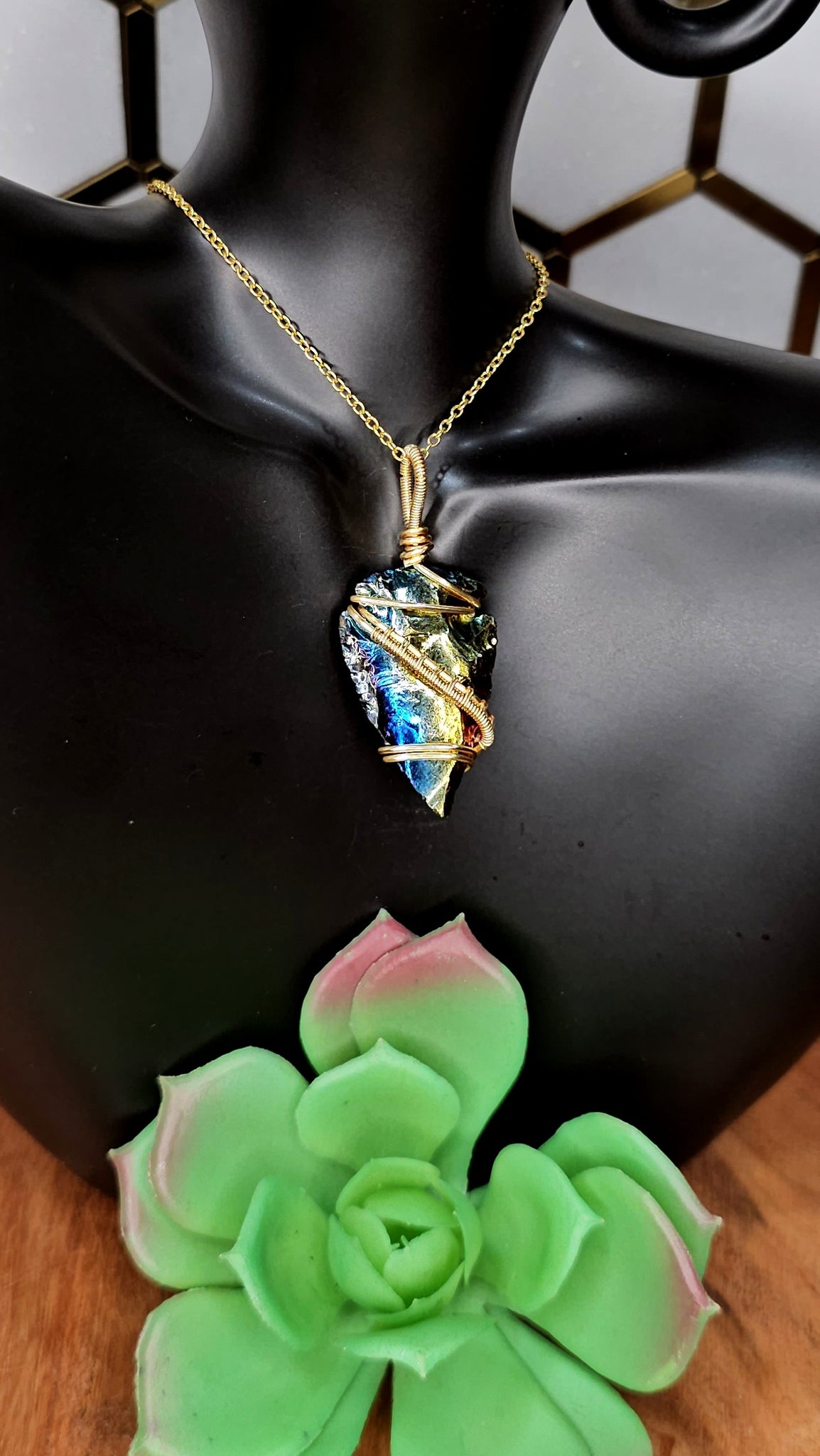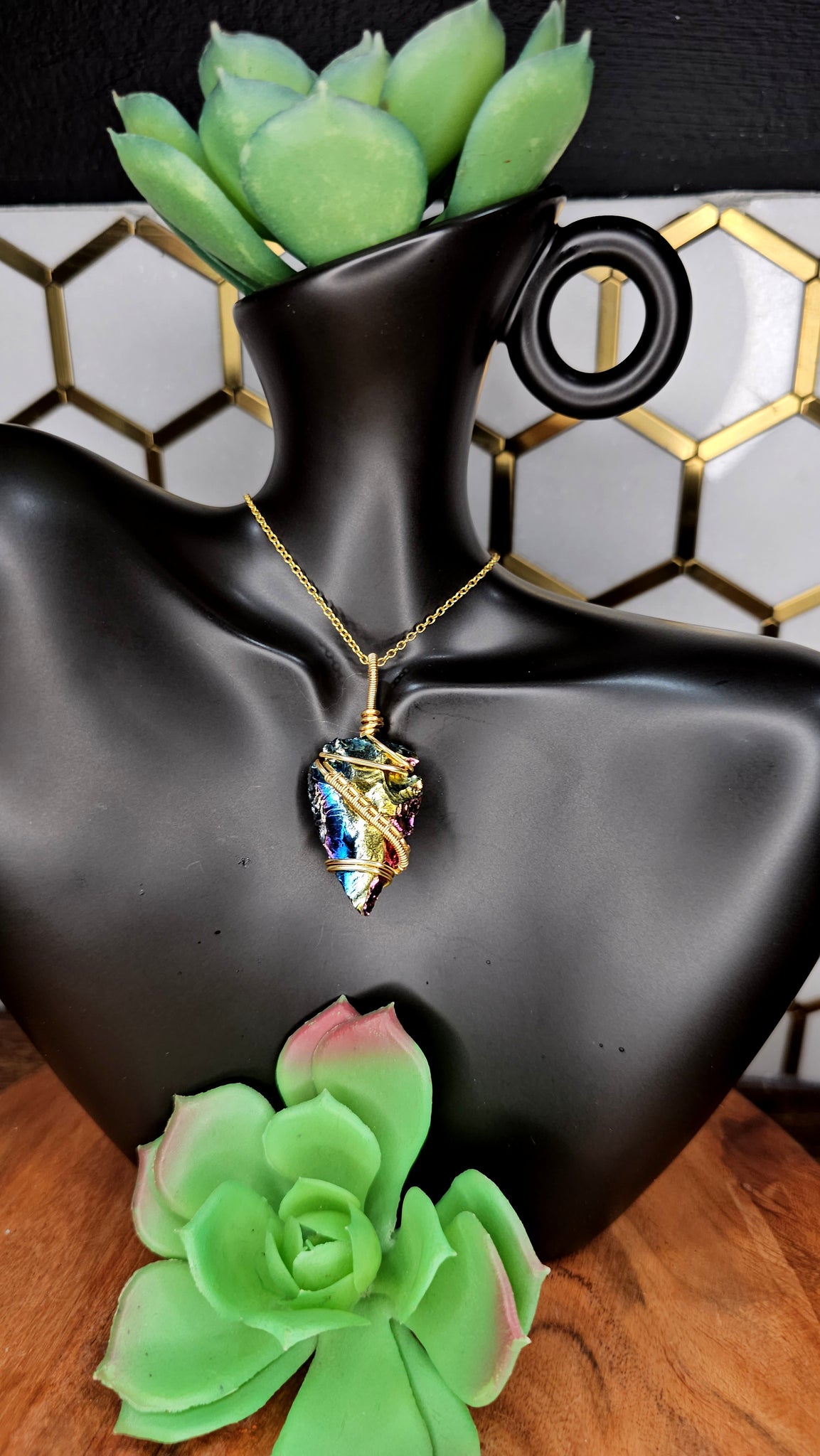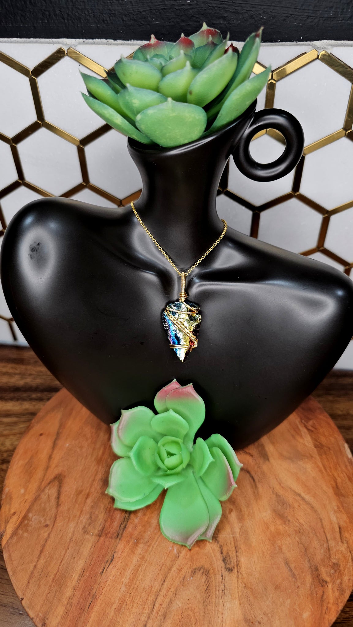 Aura Titanium Obsidian Arrowhead Pendant wrapped in gold coated copper wire.