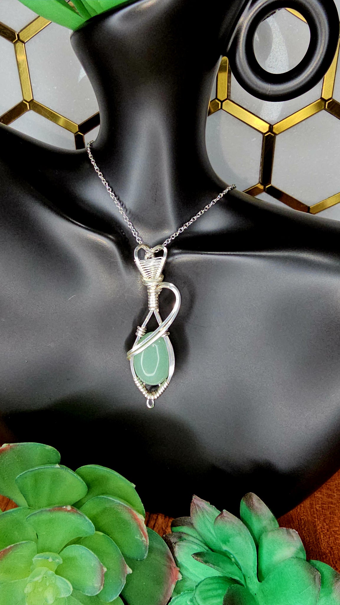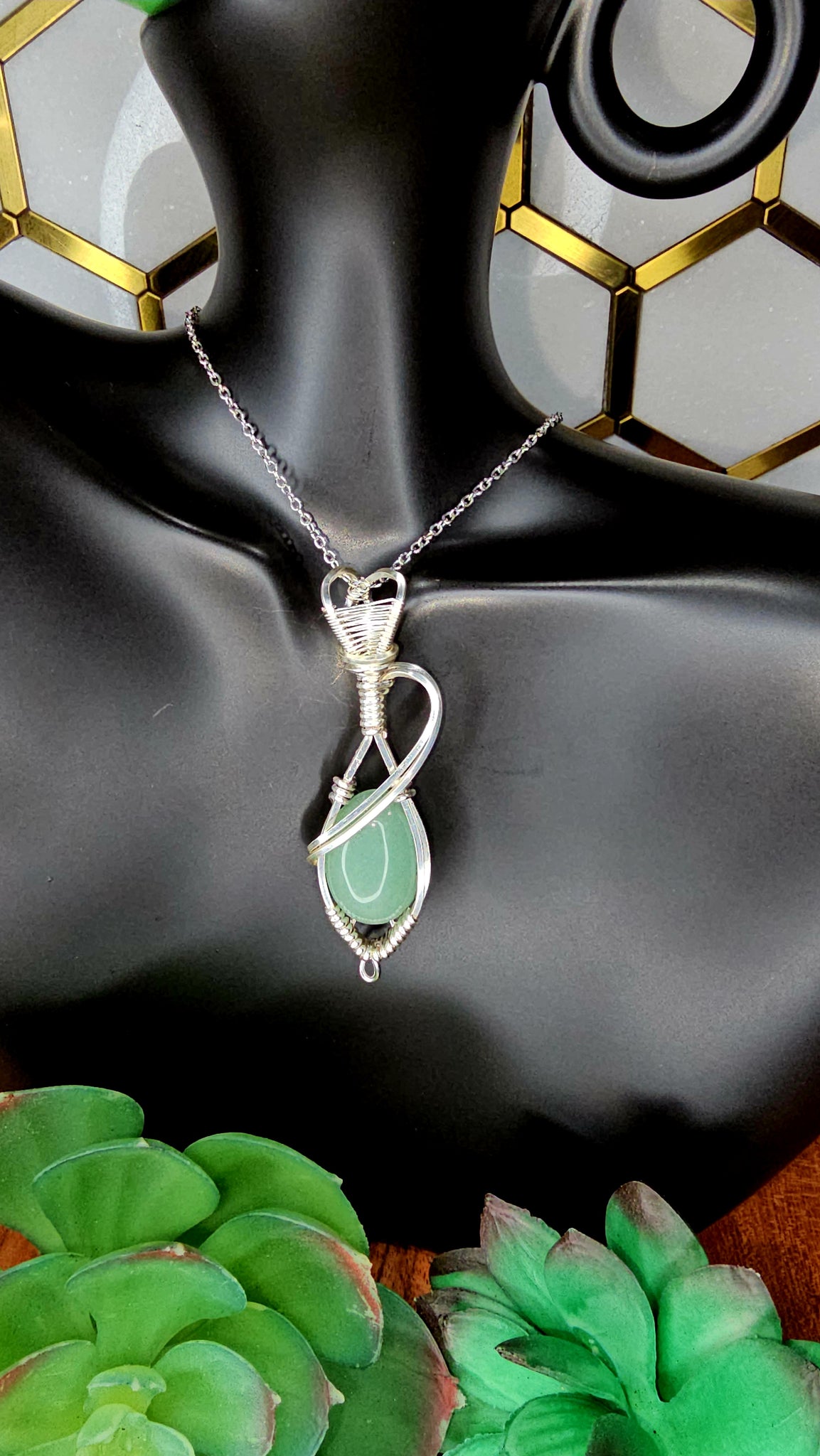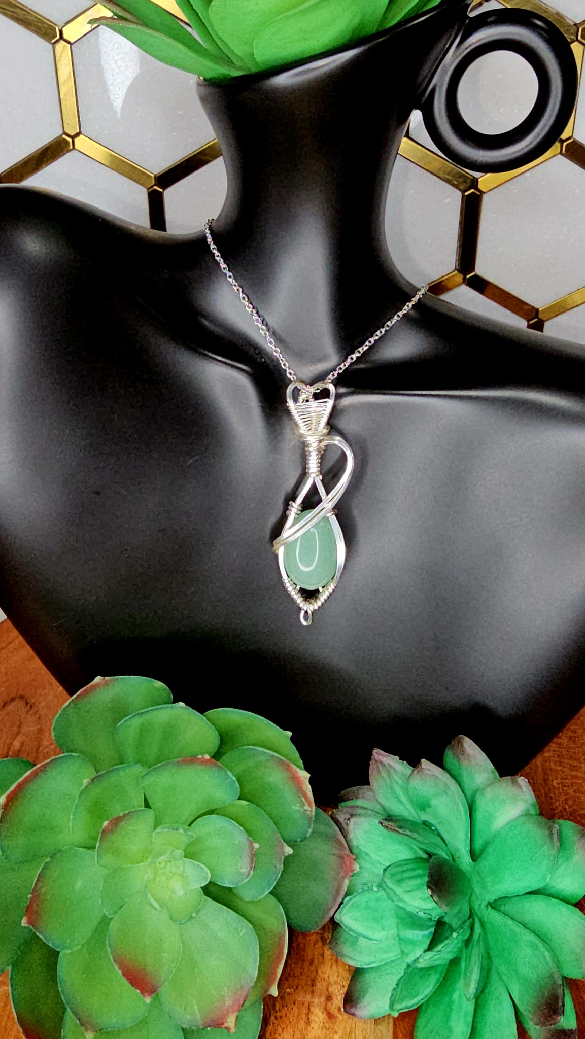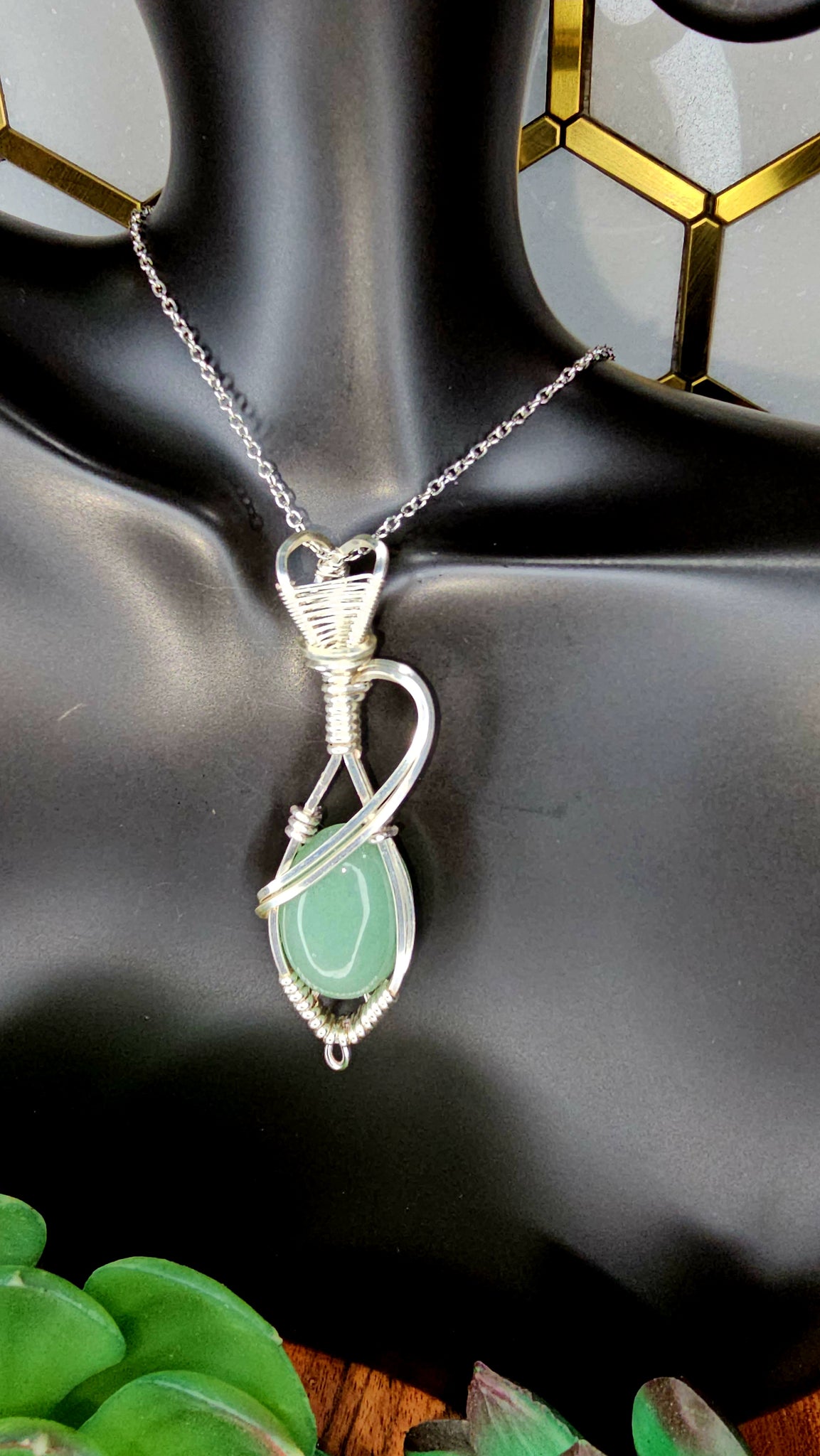 Green Aventurine wrapped in silver craft. Comes with a black cord.